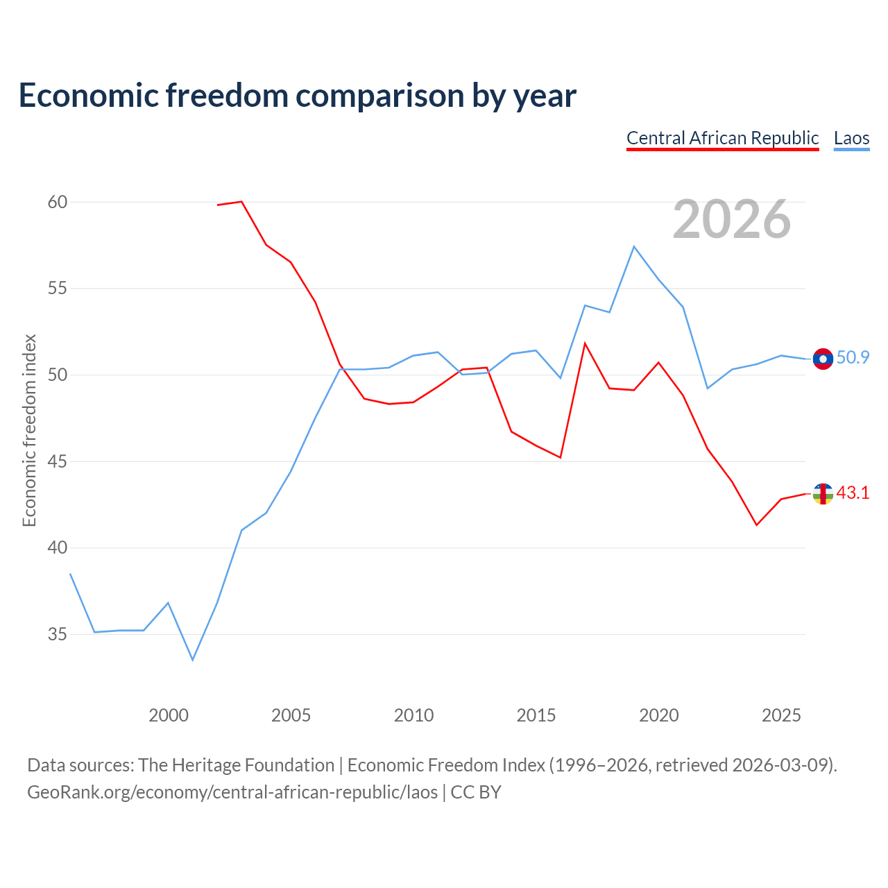 The Economic Freedom Index for the Central African Republic is 43.1, ranking 182/197, compared to 50.9 for Laos, ranking 157/197. The chart above displays a comparison of annual changes in economic freedom indexes.