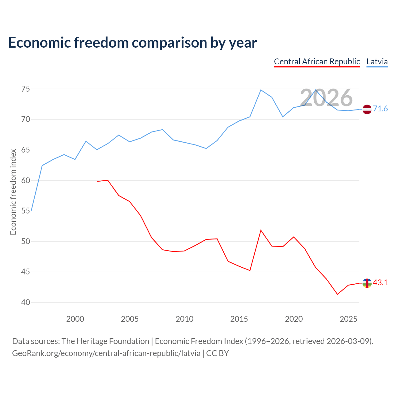 The Economic Freedom Index for the Central African Republic is 43.1, ranking 182/197, compared to 71.6 for Latvia, ranking 31/197. The chart above displays a comparison of annual changes in economic freedom indexes.