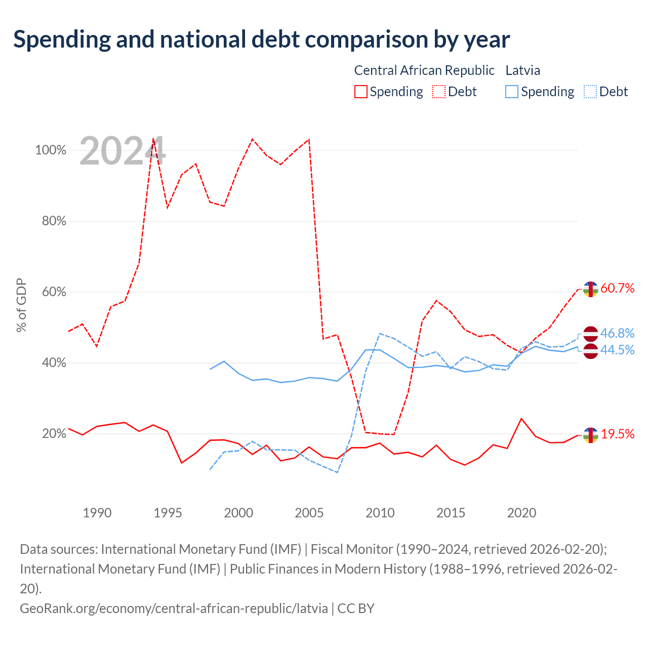 The Central African Republic has $1.67B in government debt (60.7% of GDP), compared to $20.4B (46.8% of GDP) in Latvia.