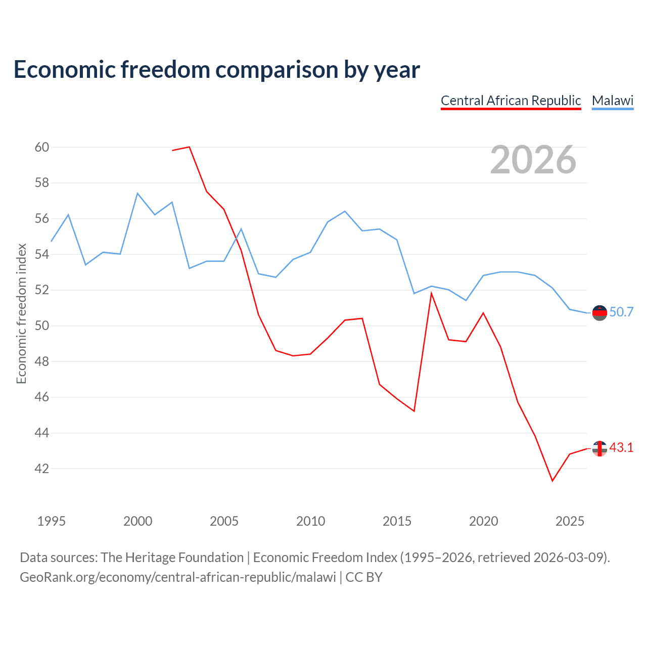 The Economic Freedom Index for the Central African Republic is 43.1, ranking 182/197, compared to 50.7 for Malawi, ranking 159/197. The chart above displays a comparison of annual changes in economic freedom indexes.