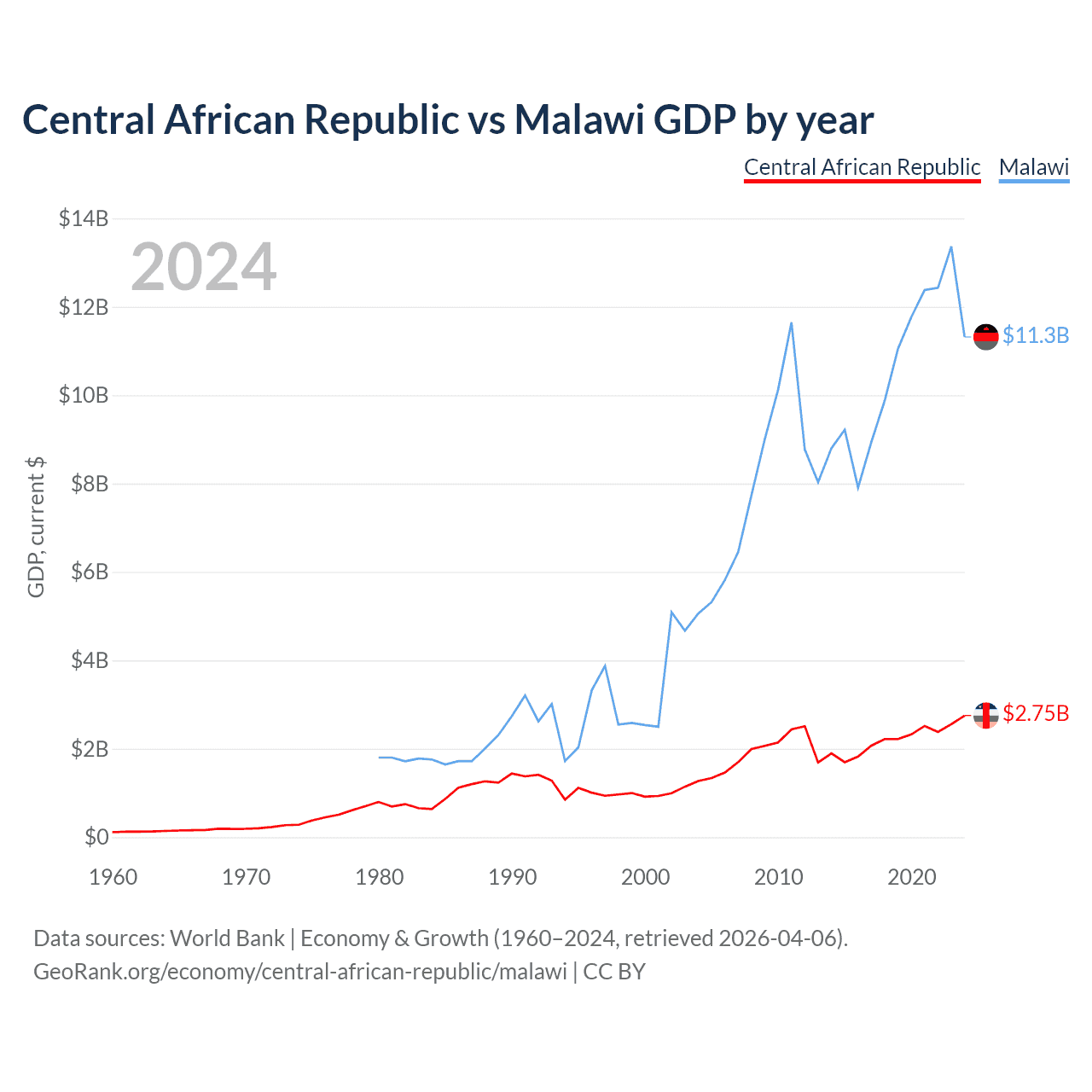 The Central African Republic has a GDP of $2.75B compared to $11.3B for Malawi, ranking 171/197 and 151/197 by economy size, respectively.