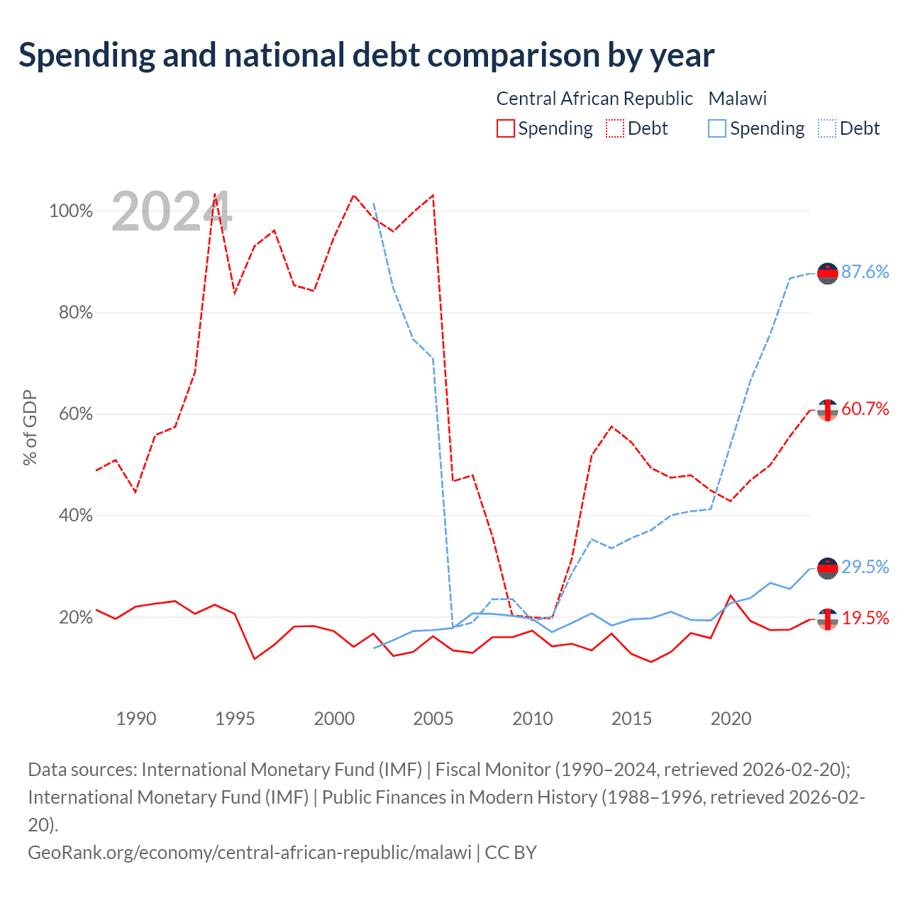 The Central African Republic has $1.67B in government debt (60.7% of GDP), compared to $9.91B (87.6% of GDP) in Malawi.
