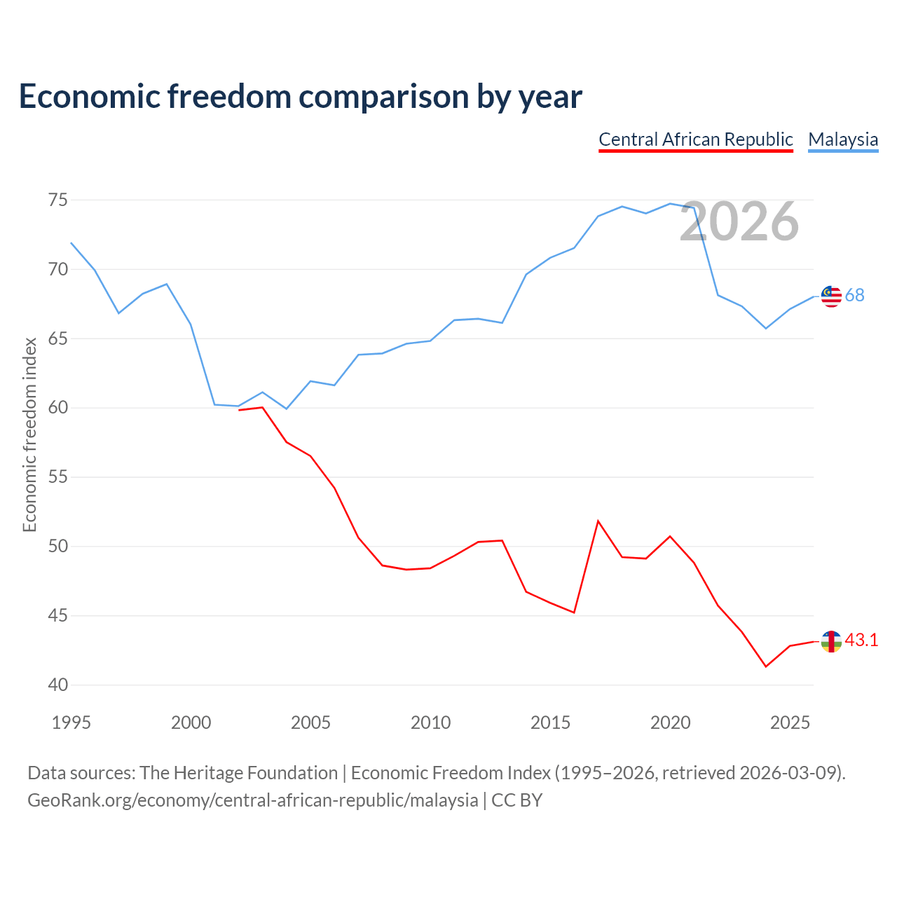 The Economic Freedom Index for the Central African Republic is 43.1, ranking 182/197, compared to 68 for Malaysia, ranking 51/197. The chart above displays a comparison of annual changes in economic freedom indexes.