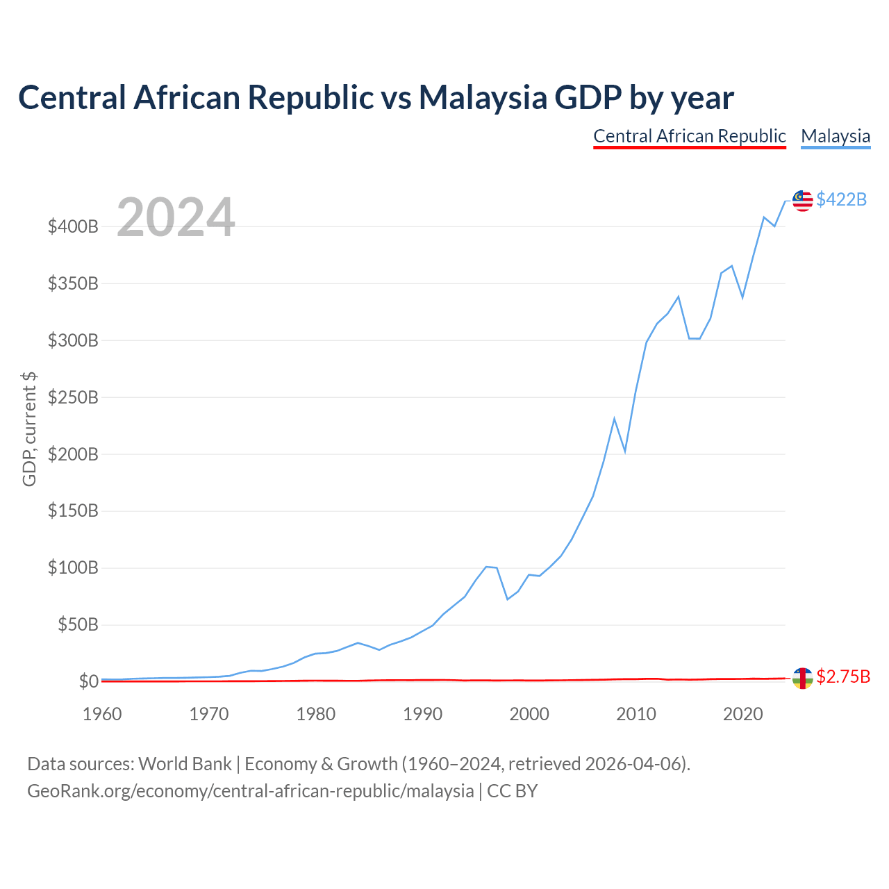 The Central African Republic has a GDP of $2.75B compared to $422B for Malaysia, ranking 171/197 and 38/197 by economy size, respectively.