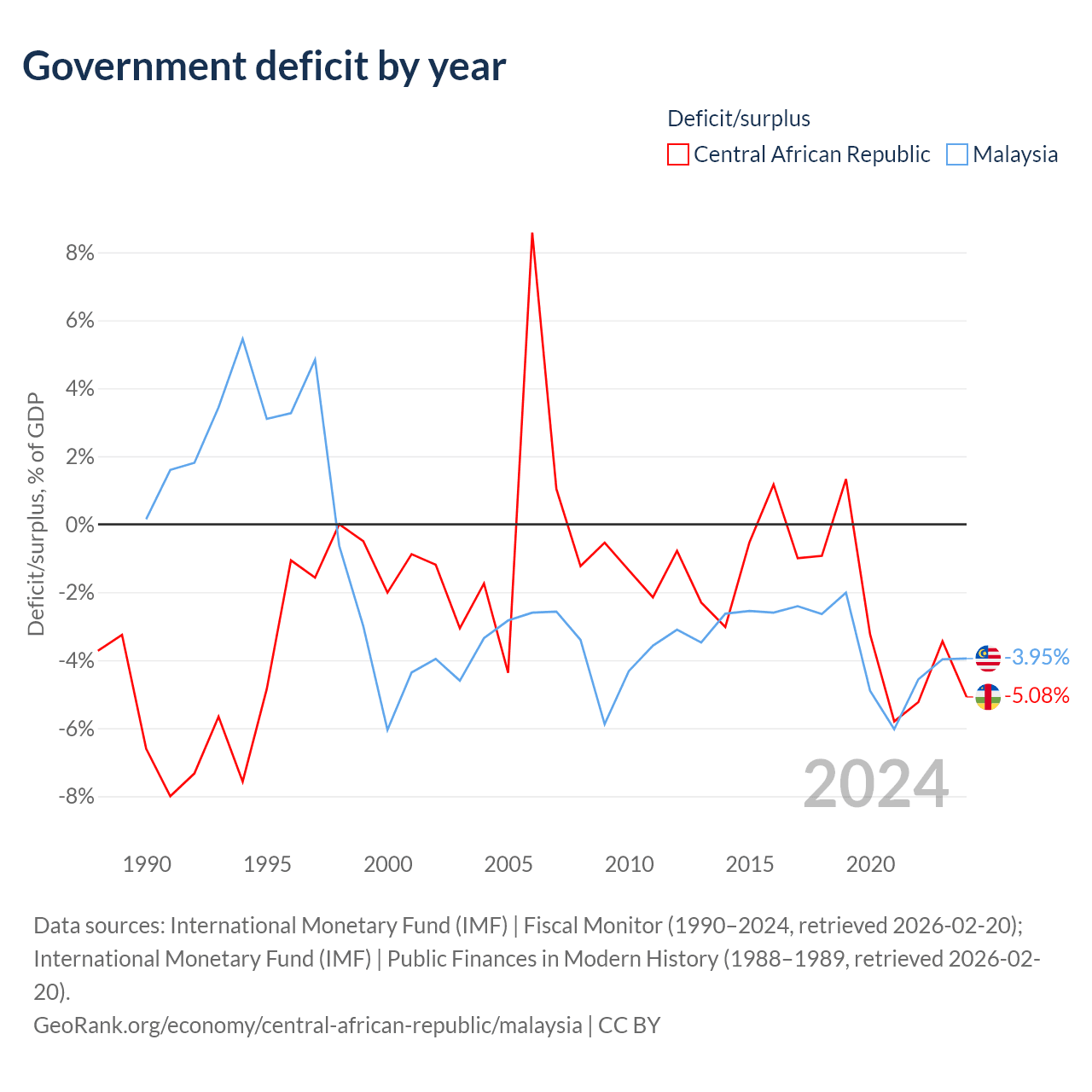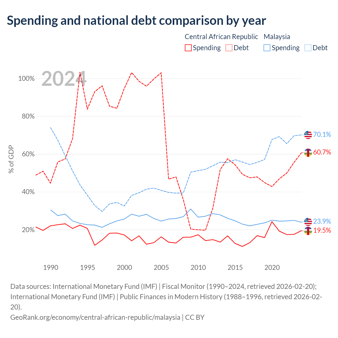 The Central African Republic has $1.67B in government debt (60.7% of GDP), compared to $296B (70.1% of GDP) in Malaysia.