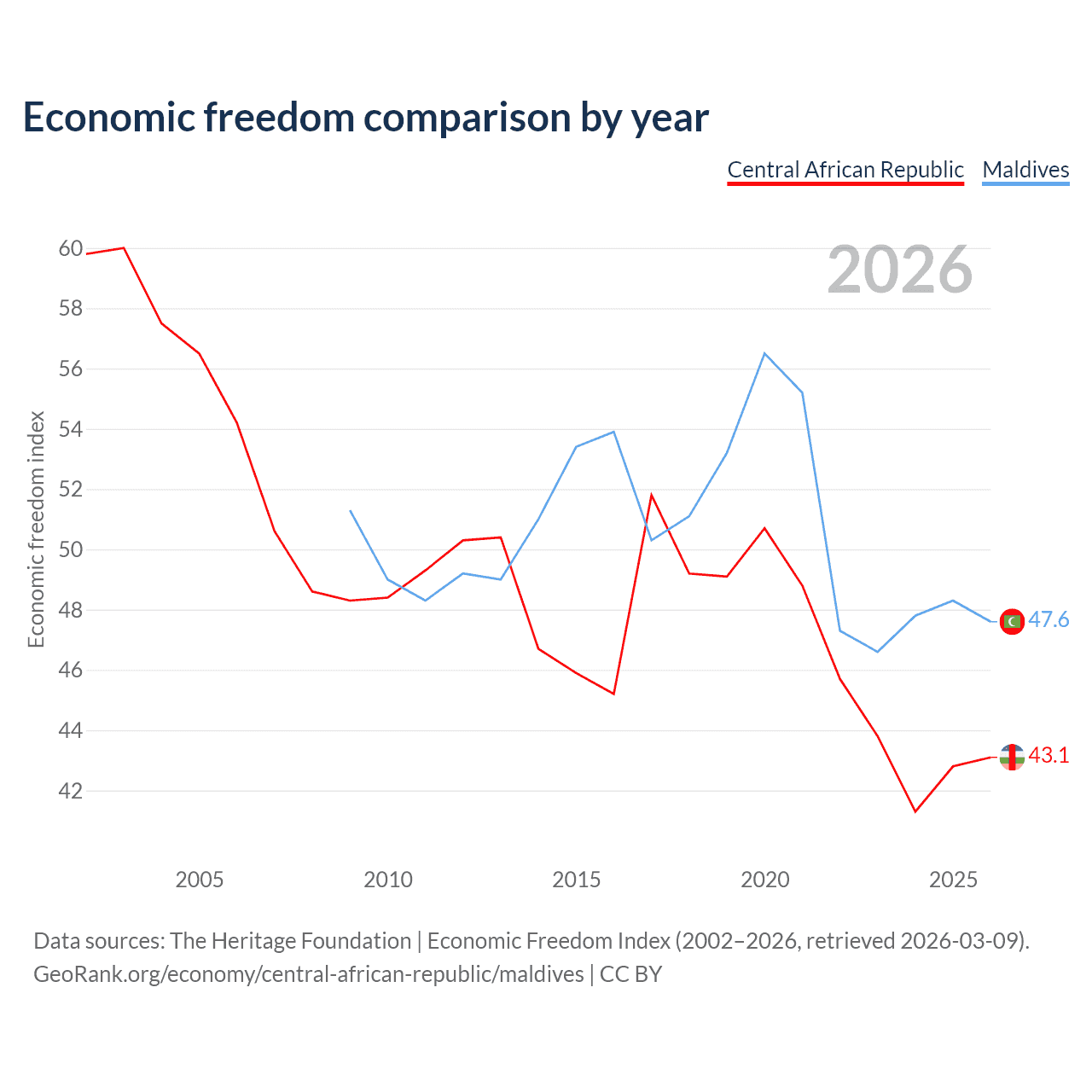 The Economic Freedom Index for the Central African Republic is 43.1, ranking 182/197, compared to 47.6 for Maldives, ranking 174/197. The chart above displays a comparison of annual changes in economic freedom indexes.