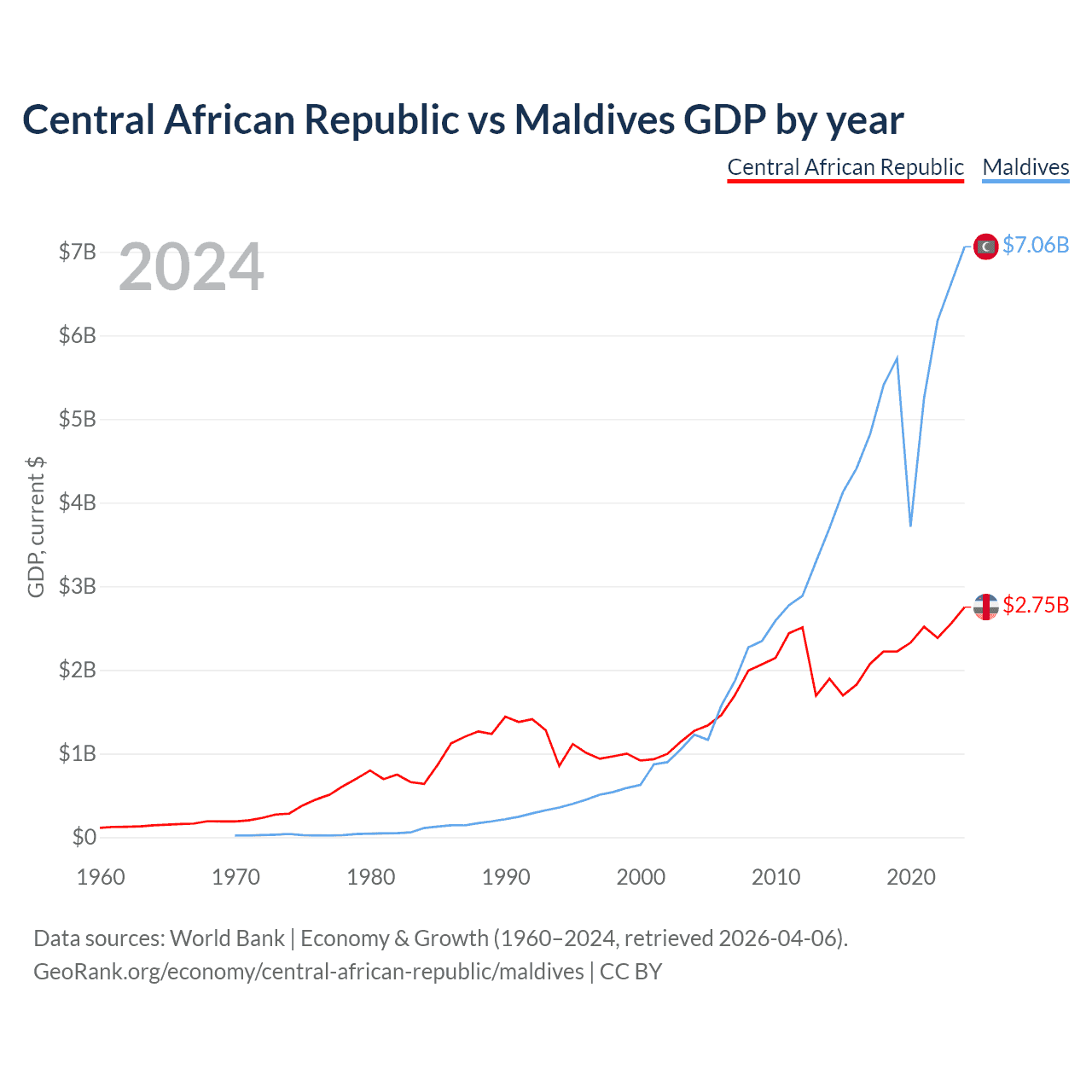 The Central African Republic has a GDP of $2.75B compared to $7.06B for Maldives, ranking 171/197 and 159/197 by economy size, respectively.