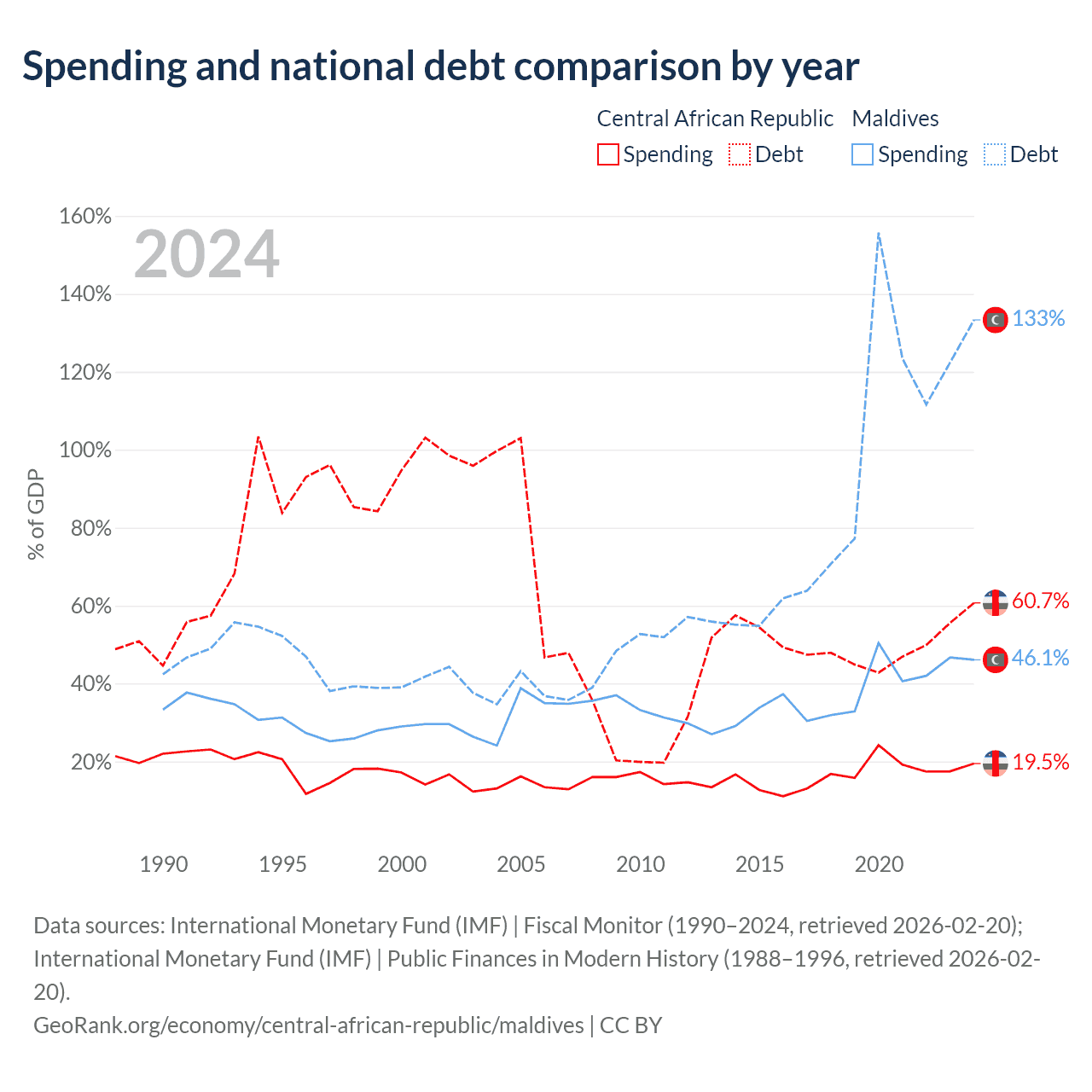 The Central African Republic has $1.67B in government debt (60.7% of GDP), compared to $9.41B (133.3% of GDP) in Maldives.
