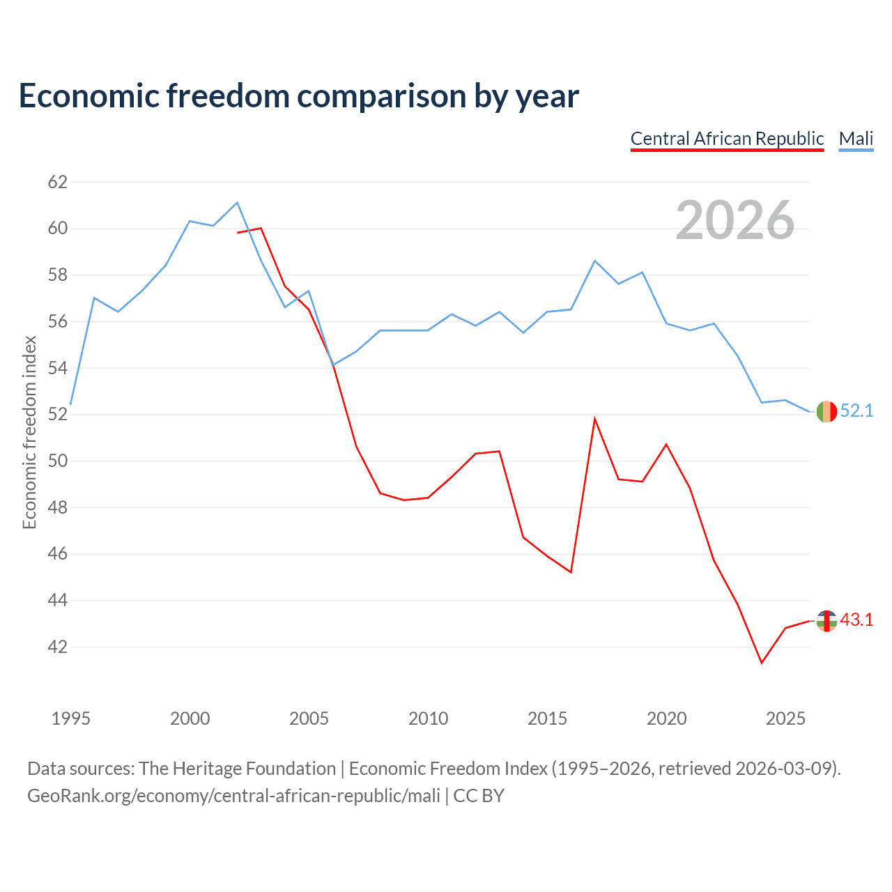 The Economic Freedom Index for the Central African Republic is 43.1, ranking 182/197, compared to 52.1 for Mali, ranking 150/197. The chart above displays a comparison of annual changes in economic freedom indexes.
