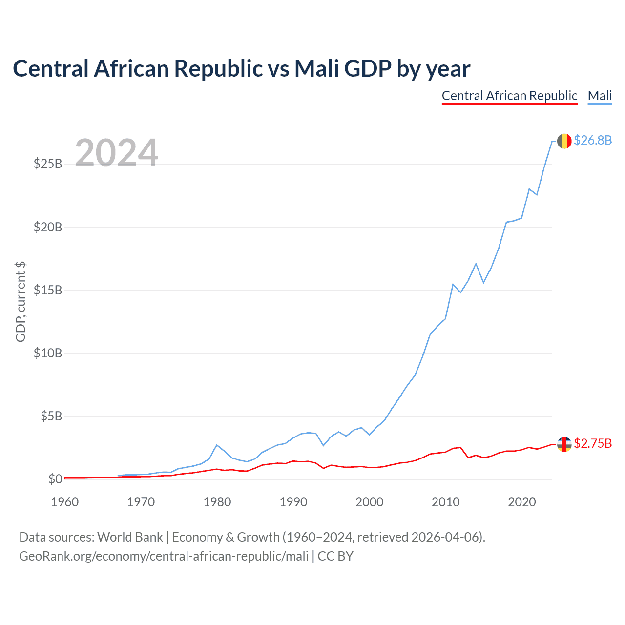 The Central African Republic has a GDP of $2.75B compared to $26.8B for Mali, ranking 171/197 and 113/197 by economy size, respectively.