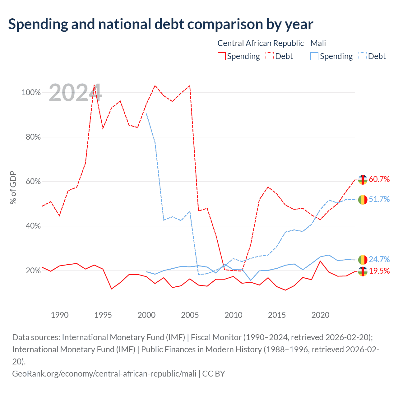 The Central African Republic has $1.67B in government debt (60.7% of GDP), compared to $13.9B (51.7% of GDP) in Mali.