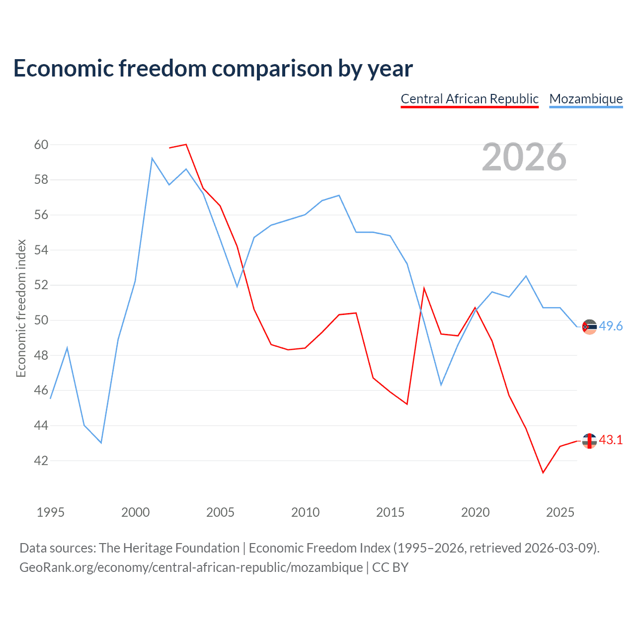 The Economic Freedom Index for the Central African Republic is 43.1, ranking 182/197, compared to 49.6 for Mozambique, ranking 164/197. The chart above displays a comparison of annual changes in economic freedom indexes.