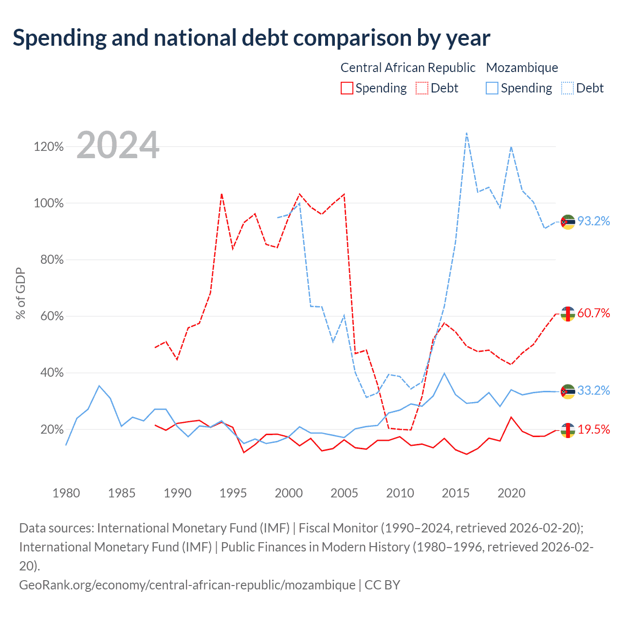 The Central African Republic has $1.67B in government debt (60.7% of GDP), compared to $21.2B (93.2% of GDP) in Mozambique.