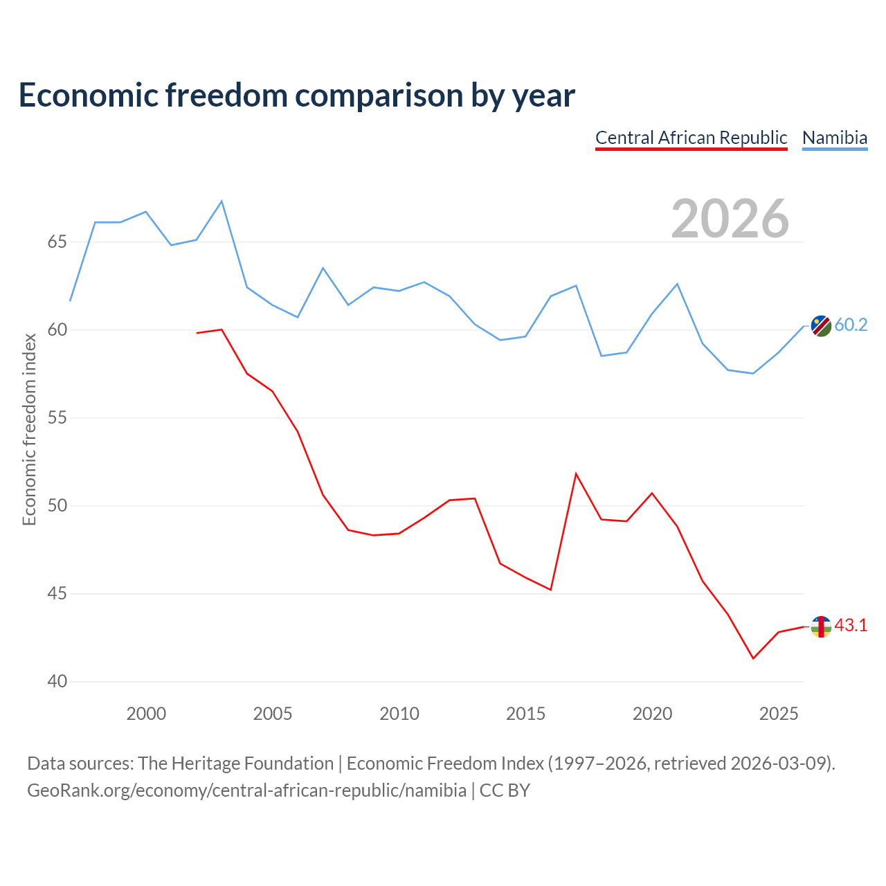 The Economic Freedom Index for the Central African Republic is 43.1, ranking 182/197, compared to 60.2 for Namibia, ranking 95/197. The chart above displays a comparison of annual changes in economic freedom indexes.