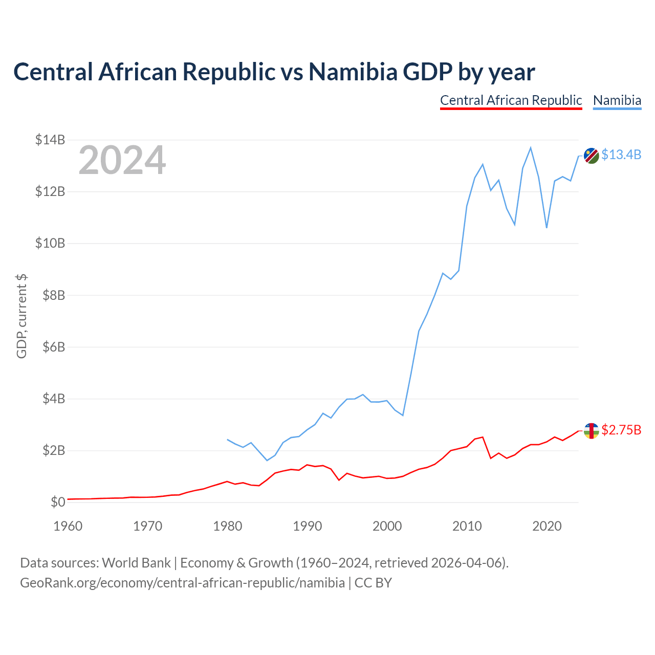 The Central African Republic has a GDP of $2.75B compared to $13.4B for Namibia, ranking 171/197 and 147/197 by economy size, respectively.