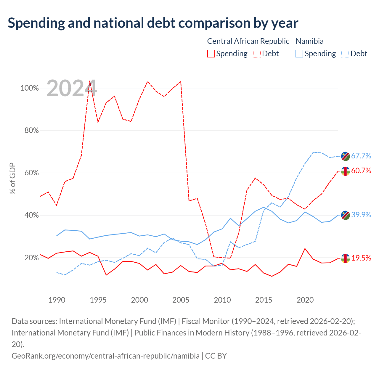 The Central African Republic has $1.67B in government debt (60.7% of GDP), compared to $9.05B (67.7% of GDP) in Namibia.