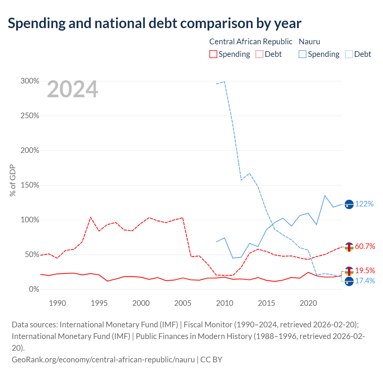 The Central African Republic has $1.67B in government debt (60.7% of GDP), compared to $28.3M (17.4% of GDP) in Nauru.