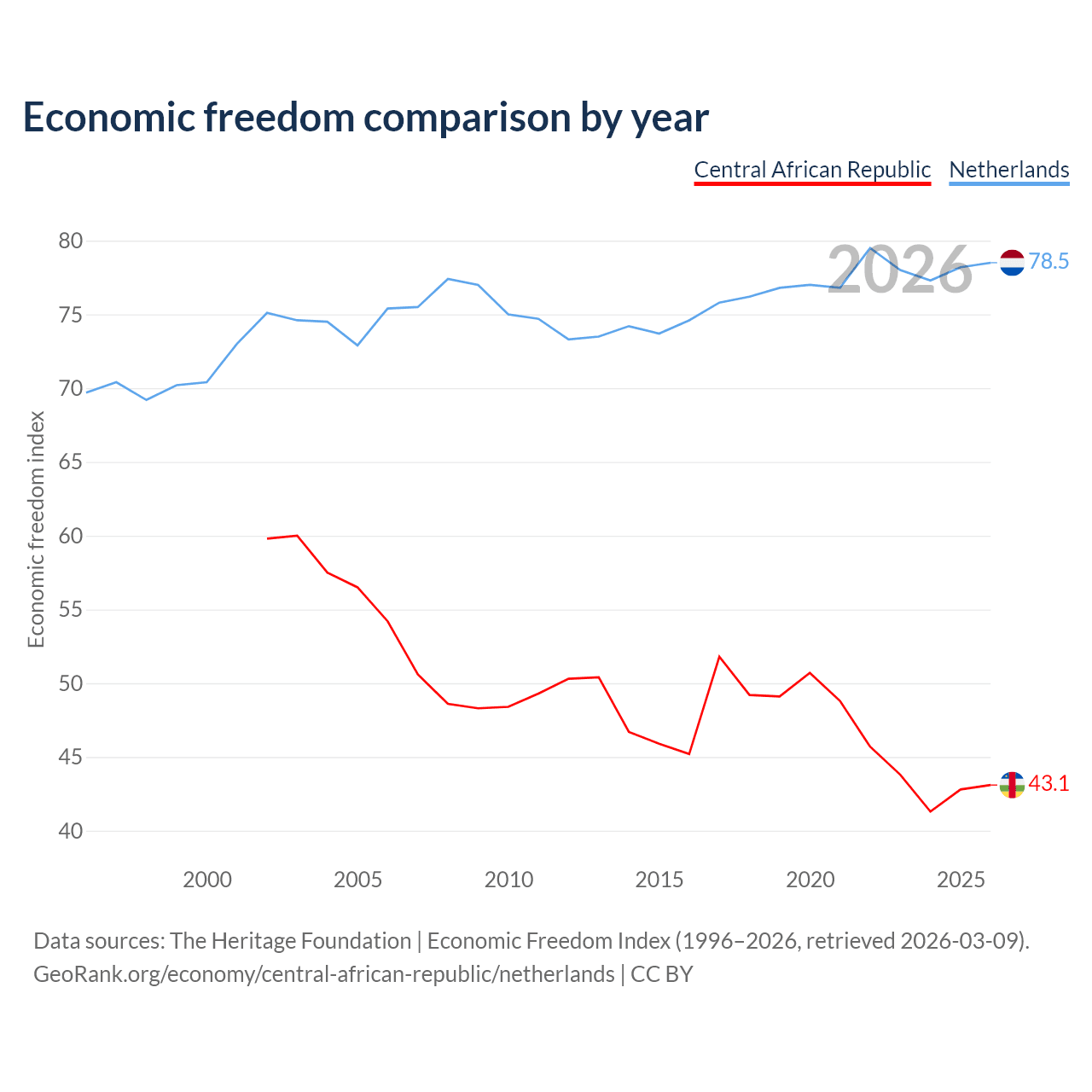 The Economic Freedom Index for the Central African Republic is 43.1, ranking 182/197, compared to 78.5 for the Netherlands, ranking 11/197. The chart above displays a comparison of annual changes in economic freedom indexes.