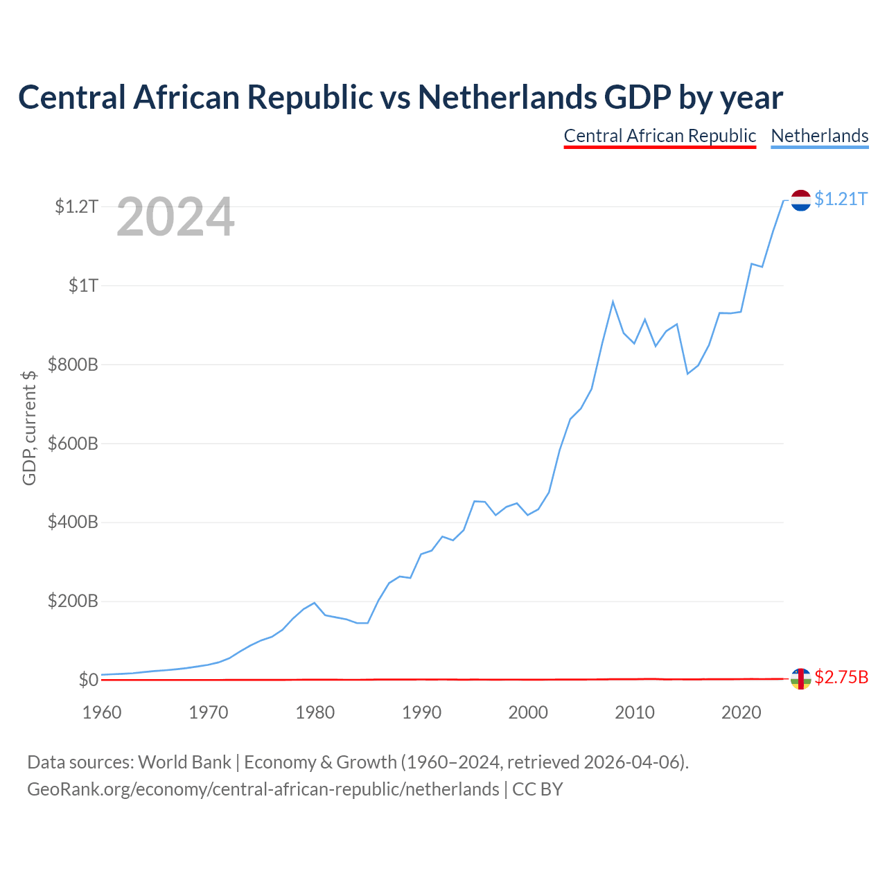 The Central African Republic has a GDP of $2.75B compared to $1.21T for the Netherlands, ranking 171/197 and 19/197 by economy size, respectively.