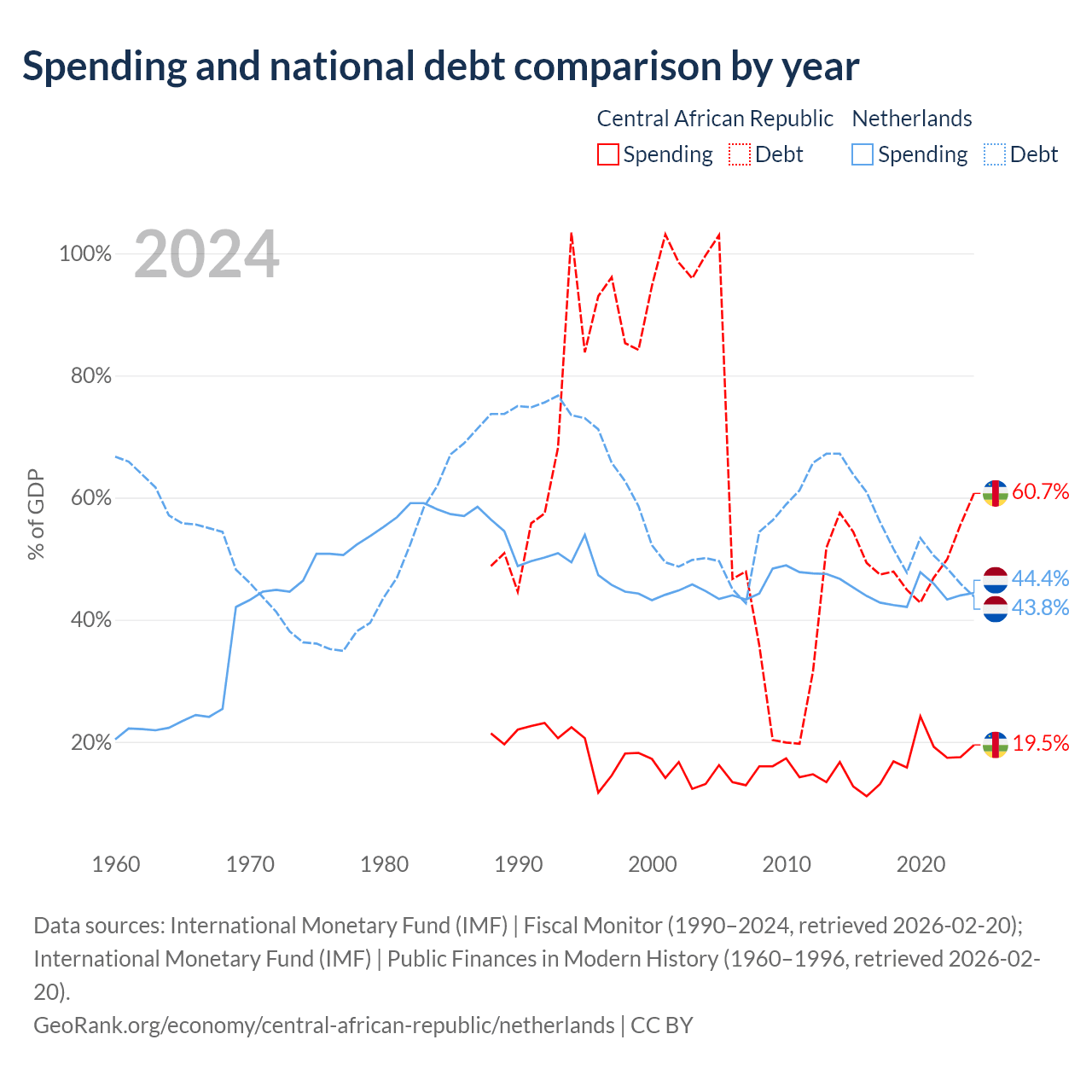 The Central African Republic has $1.67B in government debt (60.7% of GDP), compared to $532B (43.8% of GDP) in the Netherlands.