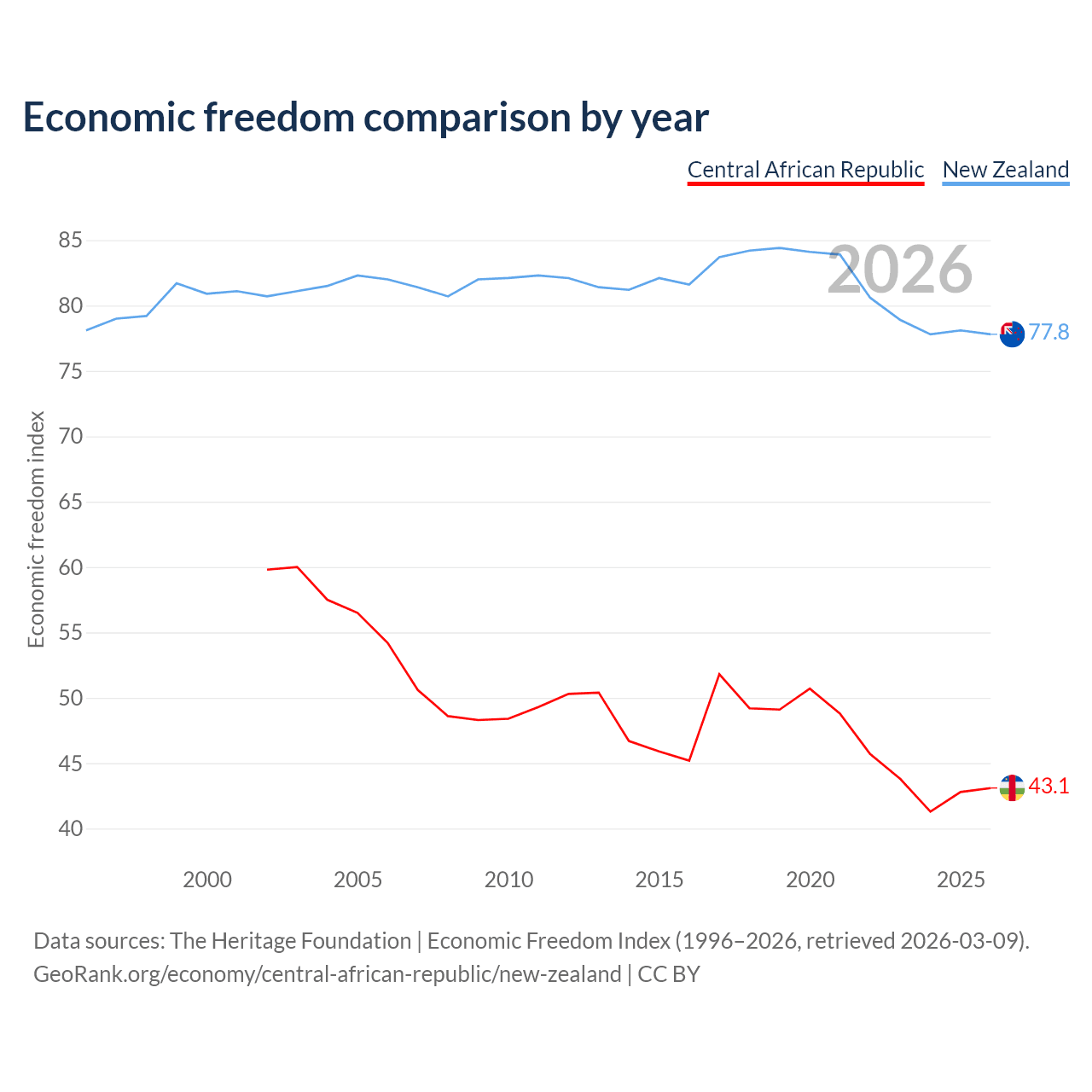 The Economic Freedom Index for the Central African Republic is 43.1, ranking 182/197, compared to 77.8 for New Zealand, ranking 13/197. The chart above displays a comparison of annual changes in economic freedom indexes.