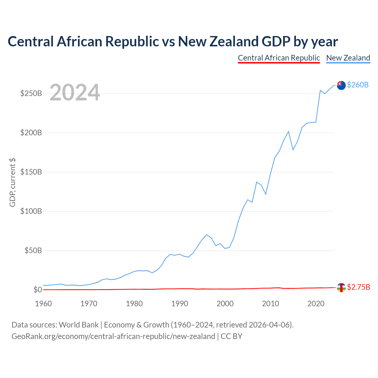 The Central African Republic has a GDP of $2.75B compared to $260B for New Zealand, ranking 171/197 and 52/197 by economy size, respectively.