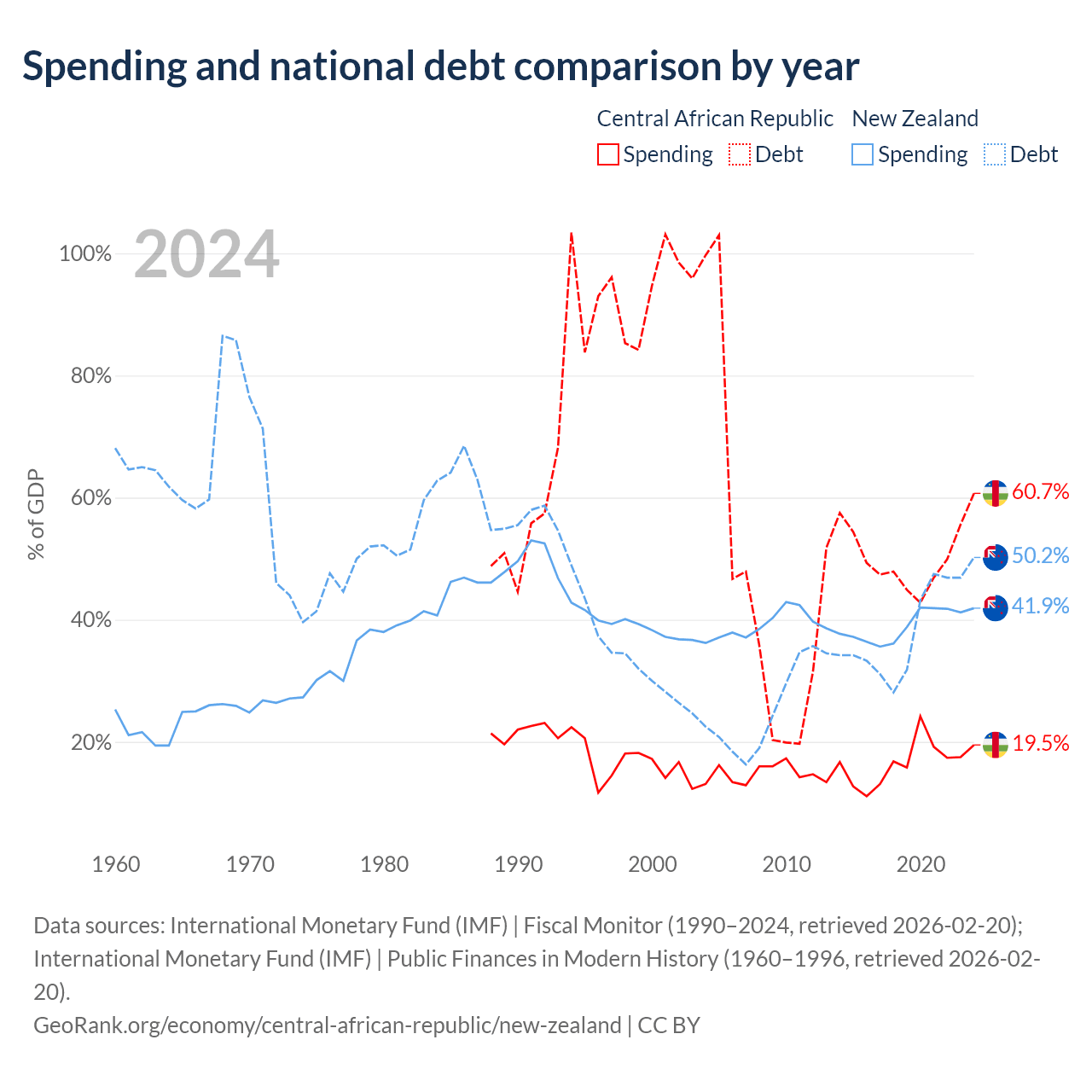 The Central African Republic has $1.67B in government debt (60.7% of GDP), compared to $131B (50.2% of GDP) in New Zealand.