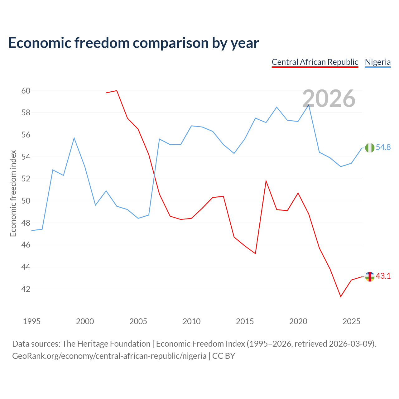 The Economic Freedom Index for the Central African Republic is 43.1, ranking 182/197, compared to 54.8 for Nigeria, ranking 132/197. The chart above displays a comparison of annual changes in economic freedom indexes.