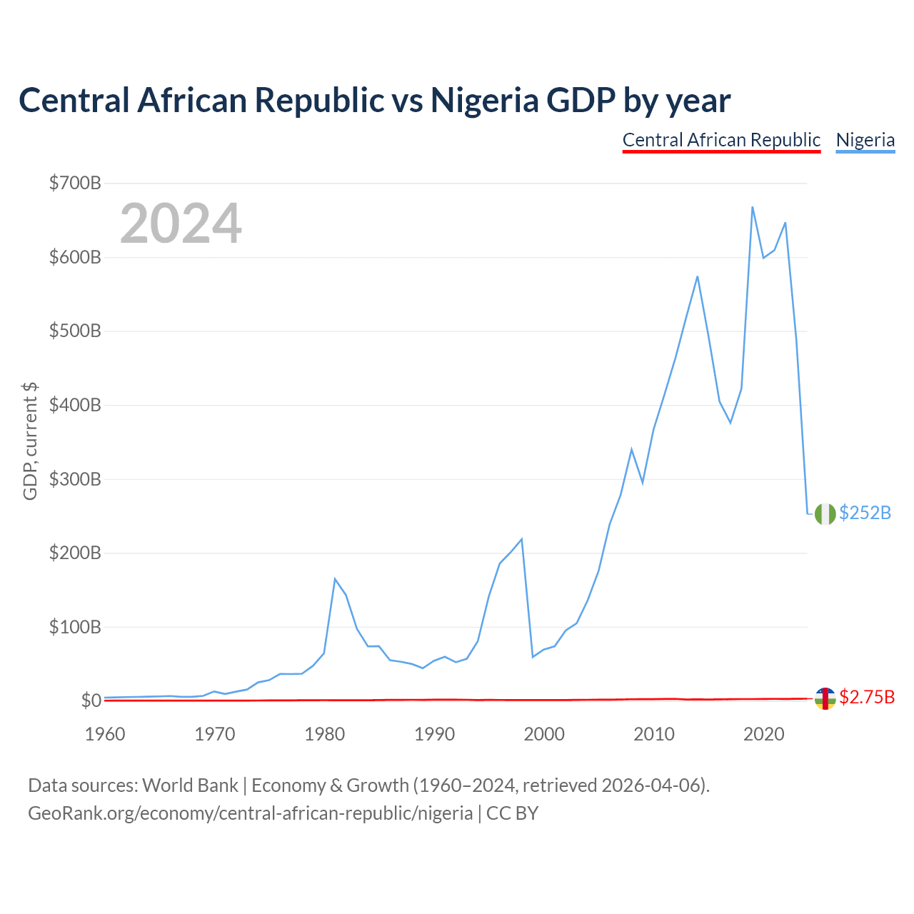 The Central African Republic has a GDP of $2.75B compared to $252B for Nigeria, ranking 171/197 and 54/197 by economy size, respectively.