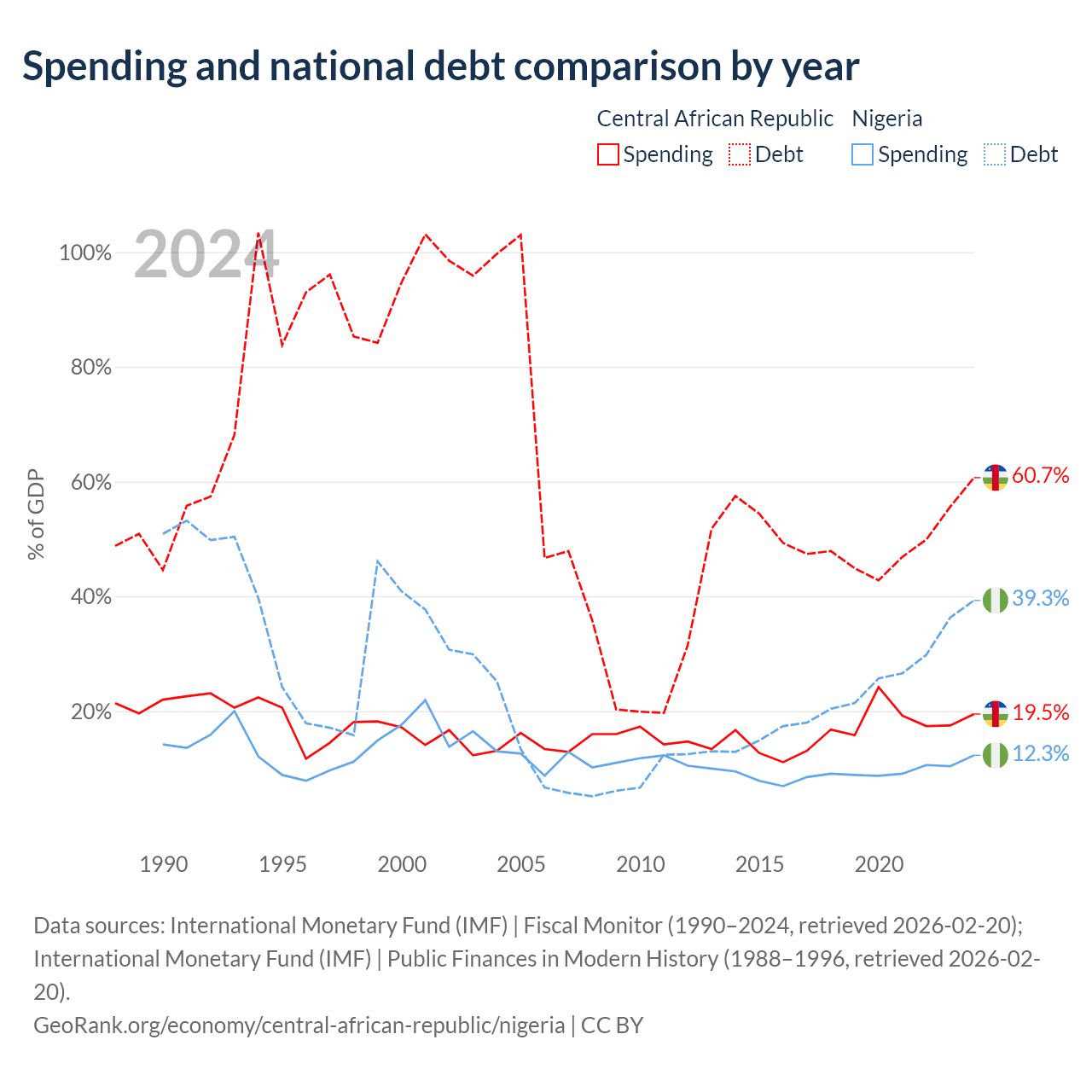 The Central African Republic has $1.67B in government debt (60.7% of GDP), compared to $99.2B (39.3% of GDP) in Nigeria.