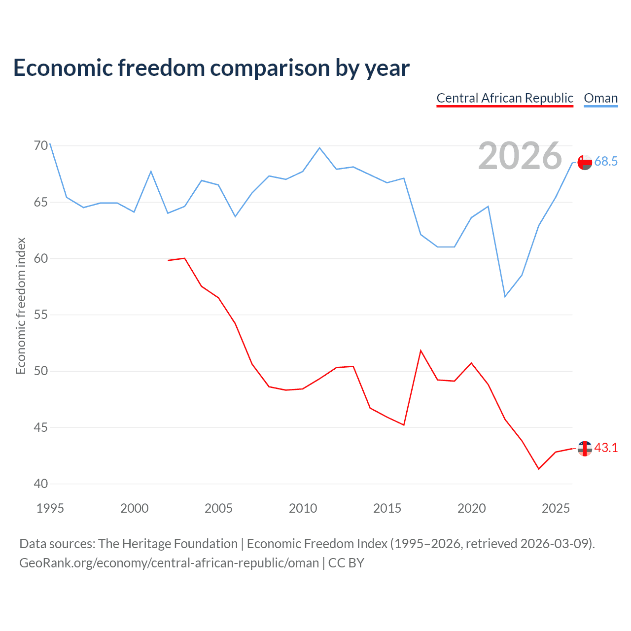 The Economic Freedom Index for the Central African Republic is 43.1, ranking 182/197, compared to 68.5 for Oman, ranking 45/197. The chart above displays a comparison of annual changes in economic freedom indexes.