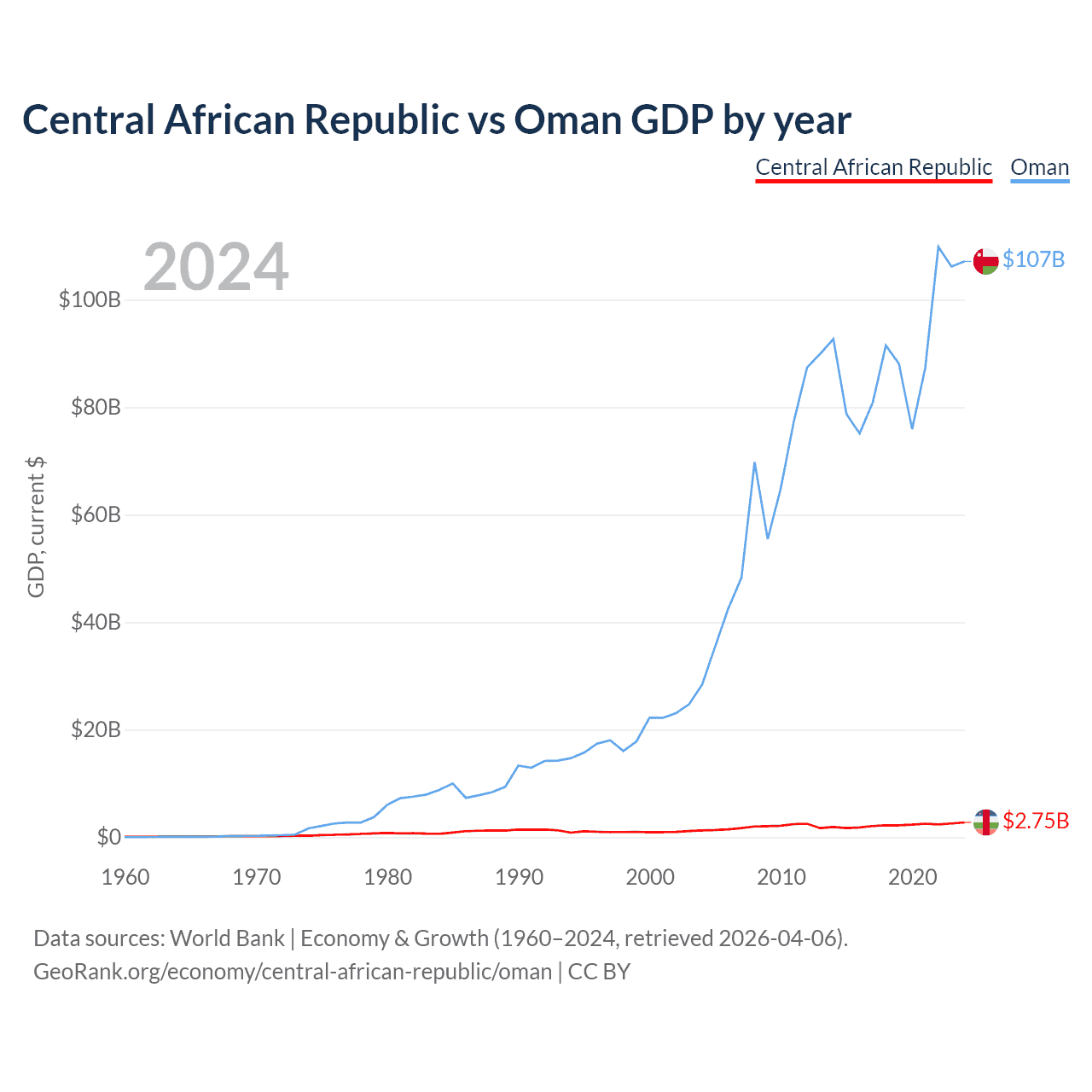 The Central African Republic has a GDP of $2.75B compared to $107B for Oman, ranking 171/197 and 70/197 by economy size, respectively.