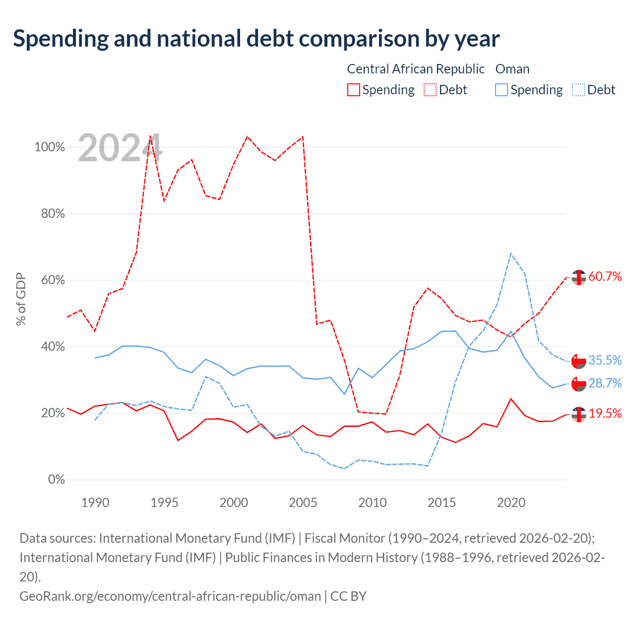 The Central African Republic has $1.67B in government debt (60.7% of GDP), compared to $38B (35.5% of GDP) in Oman.