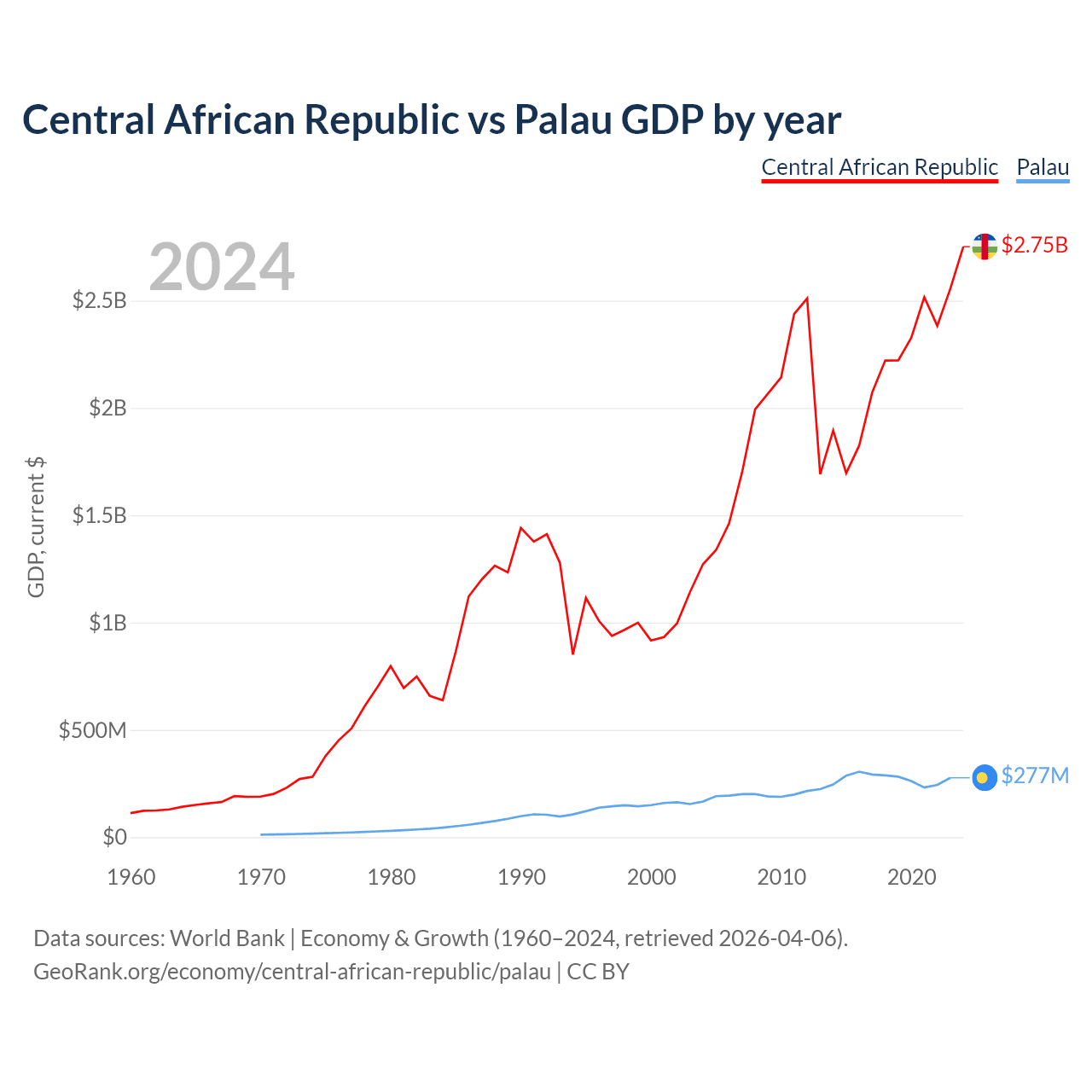 The Central African Republic has a GDP of $2.75B compared to $277M for Palau, ranking 171/197 and 194/197 by economy size, respectively.