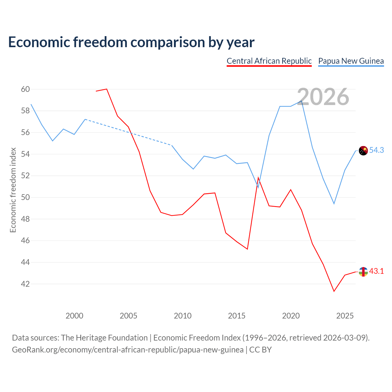 The Economic Freedom Index for the Central African Republic is 43.1, ranking 182/197, compared to 54.3 for Papua New Guinea, ranking 134/197. The chart above displays a comparison of annual changes in economic freedom indexes.