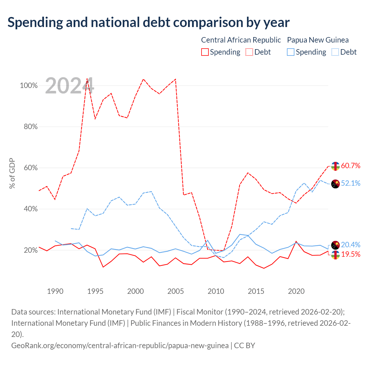 The Central African Republic has $1.67B in government debt (60.7% of GDP), compared to $16.6B (52.1% of GDP) in Papua New Guinea.