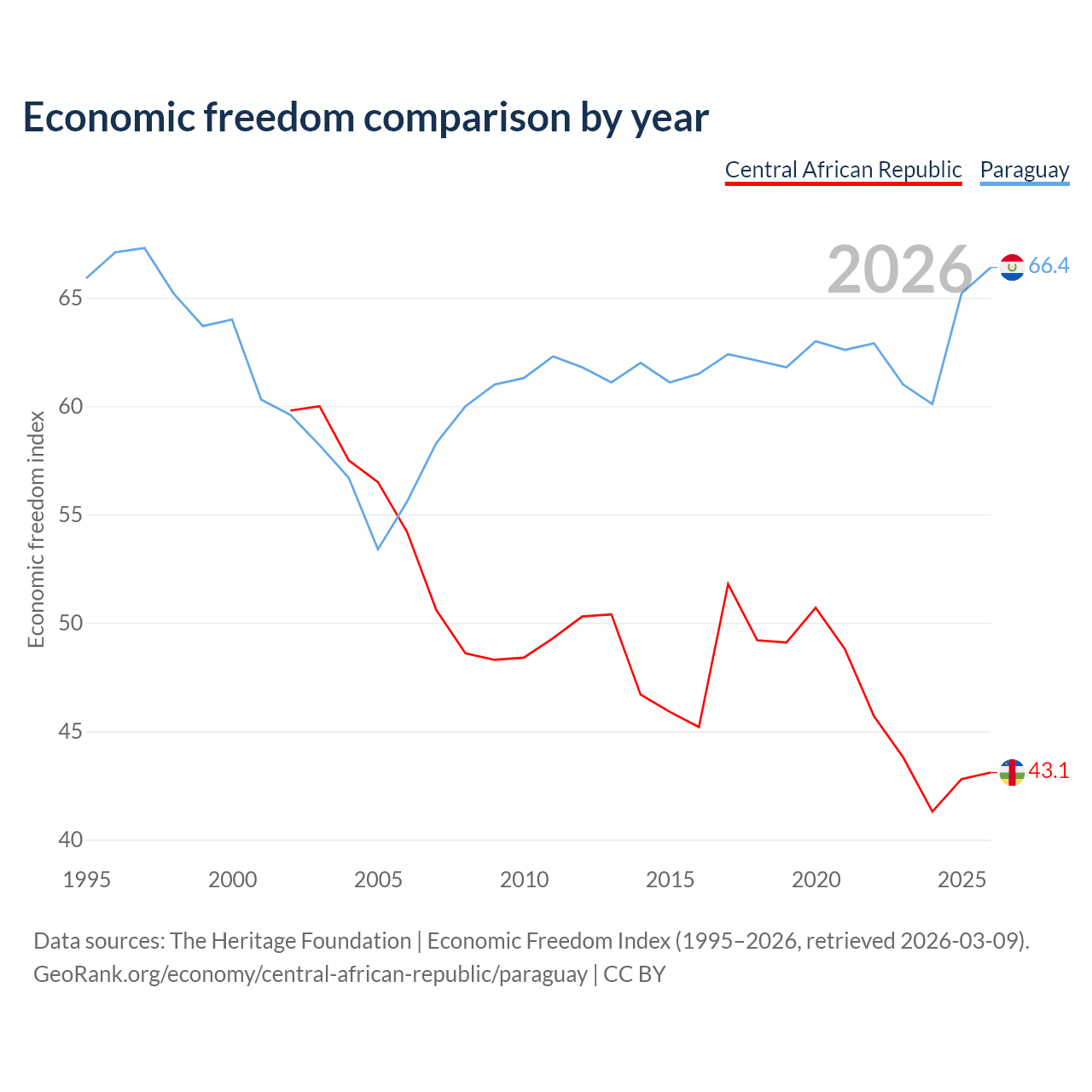 The Economic Freedom Index for the Central African Republic is 43.1, ranking 182/197, compared to 66.4 for Paraguay, ranking 61/197. The chart above displays a comparison of annual changes in economic freedom indexes.