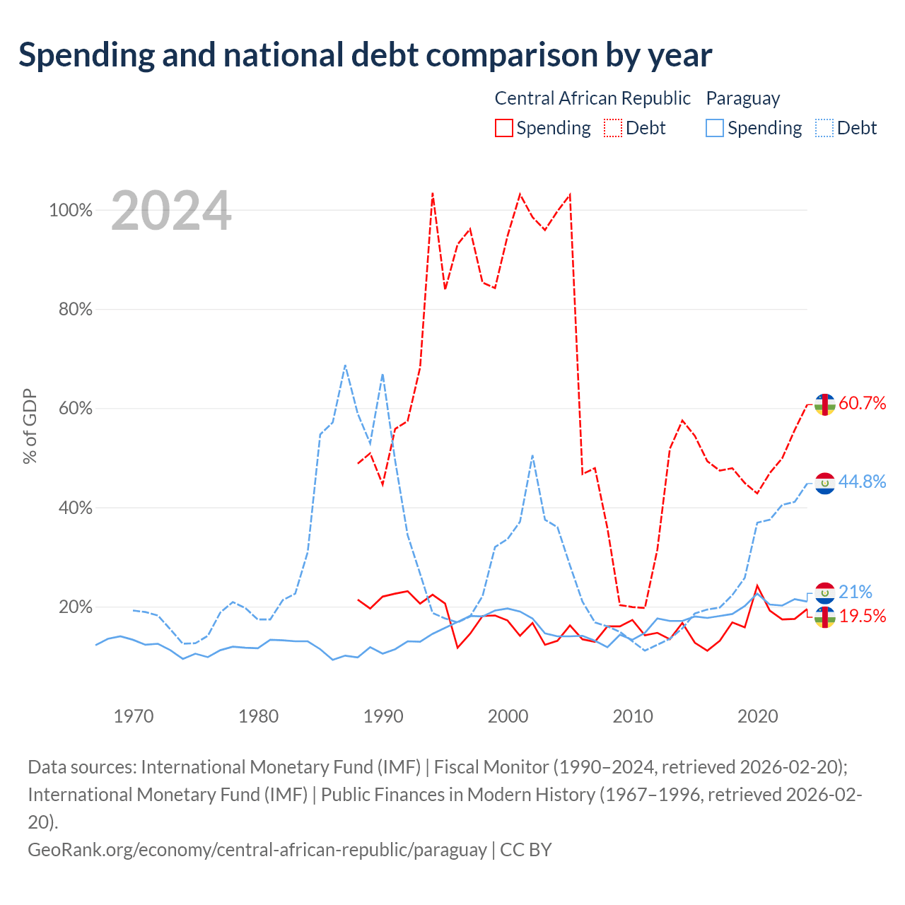 The Central African Republic has $1.67B in government debt (60.7% of GDP), compared to $19.9B (44.8% of GDP) in Paraguay.