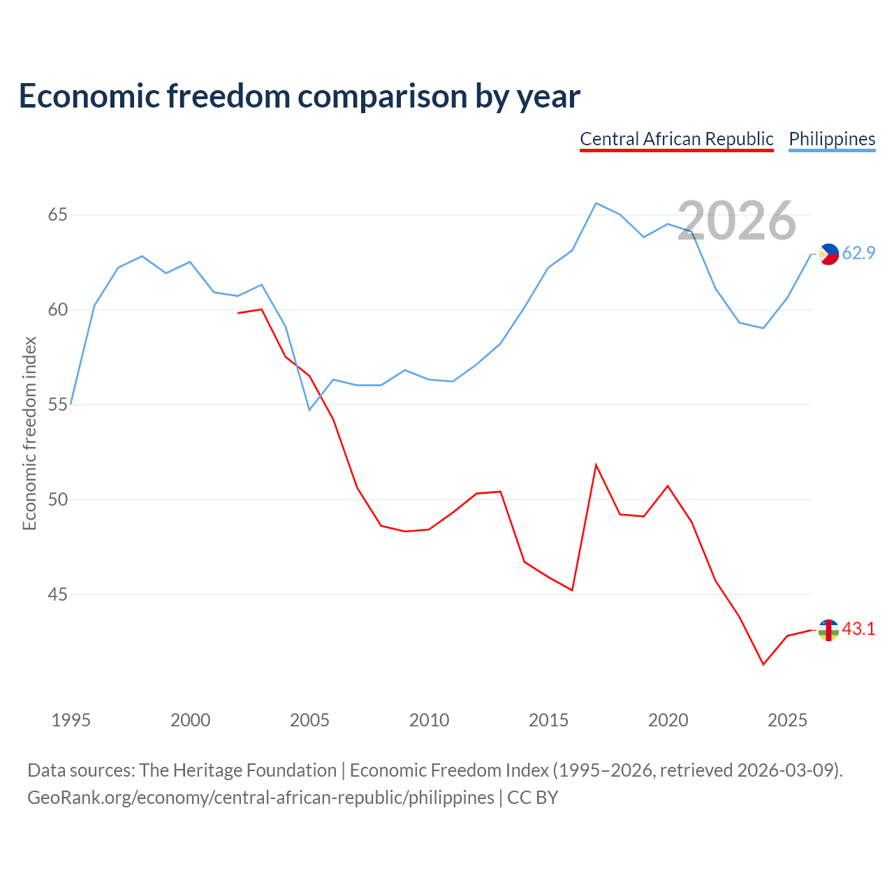 The Economic Freedom Index for the Central African Republic is 43.1, ranking 182/197, compared to 62.9 for the Philippines, ranking 85/197. The chart above displays a comparison of annual changes in economic freedom indexes.