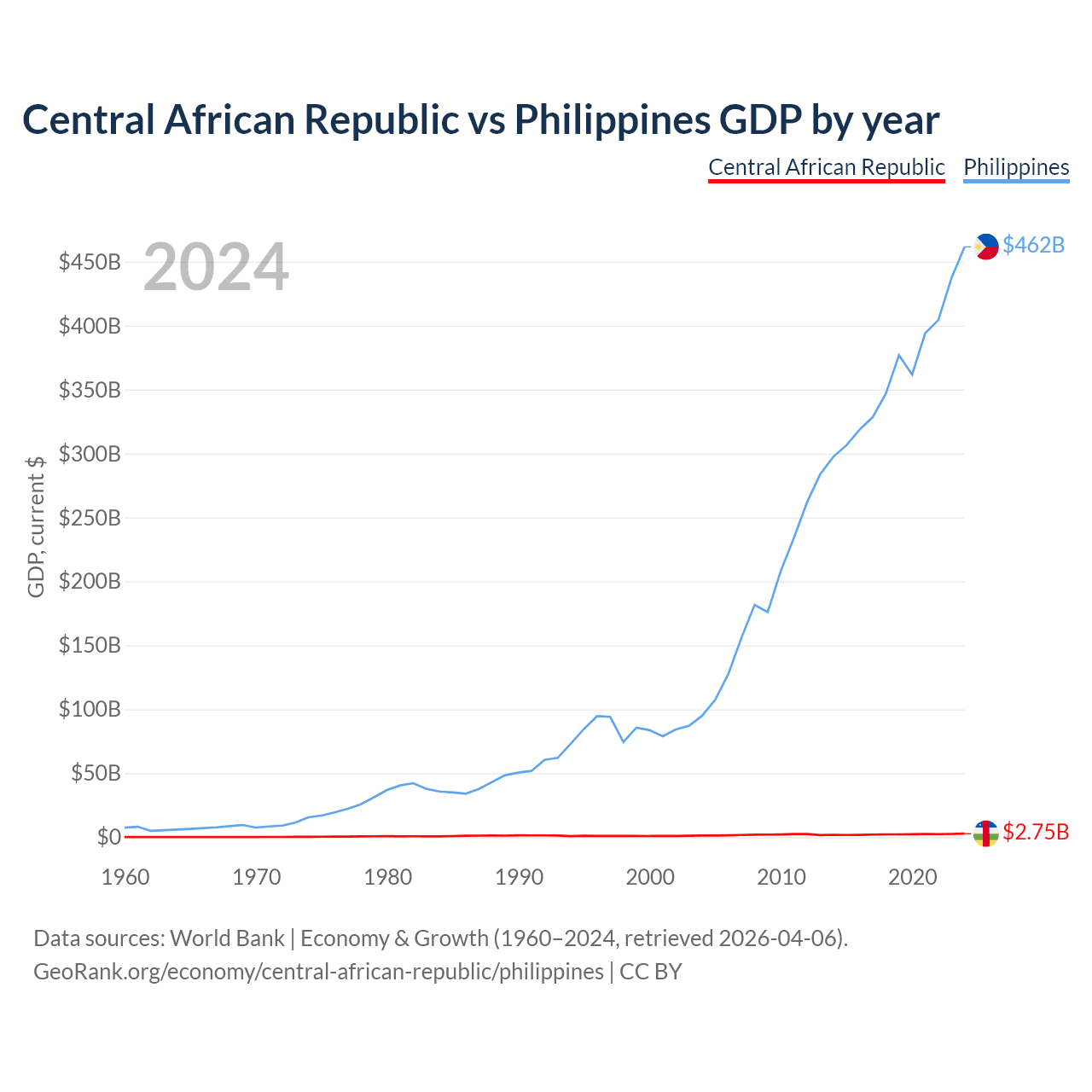 The Central African Republic has a GDP of $2.75B compared to $462B for the Philippines, ranking 171/197 and 35/197 by economy size, respectively.