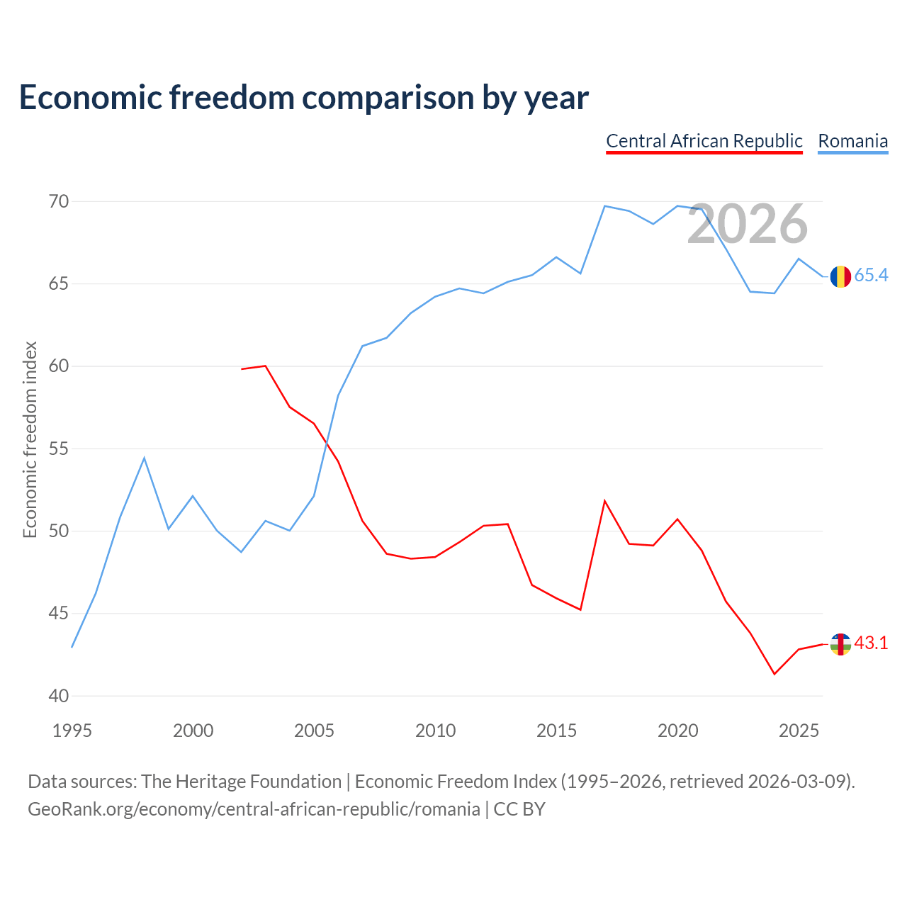 The Economic Freedom Index for the Central African Republic is 43.1, ranking 182/197, compared to 65.4 for Romania, ranking 64/197. The chart above displays a comparison of annual changes in economic freedom indexes.