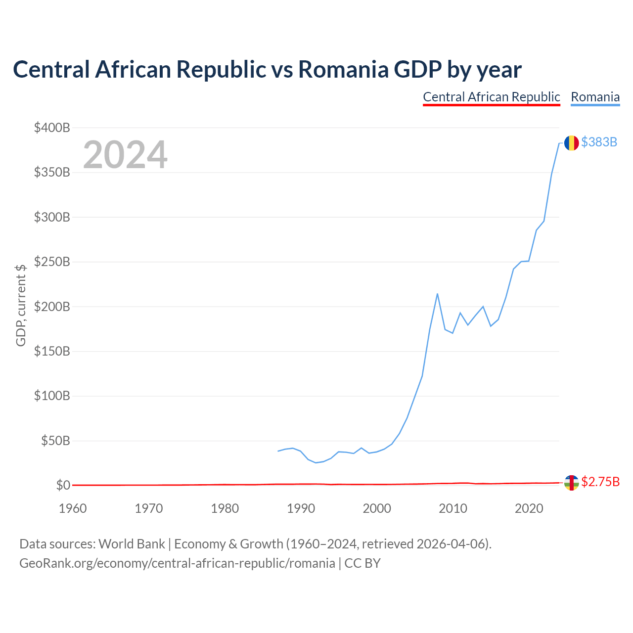 The Central African Republic has a GDP of $2.75B compared to $383B for Romania, ranking 171/197 and 42/197 by economy size, respectively.