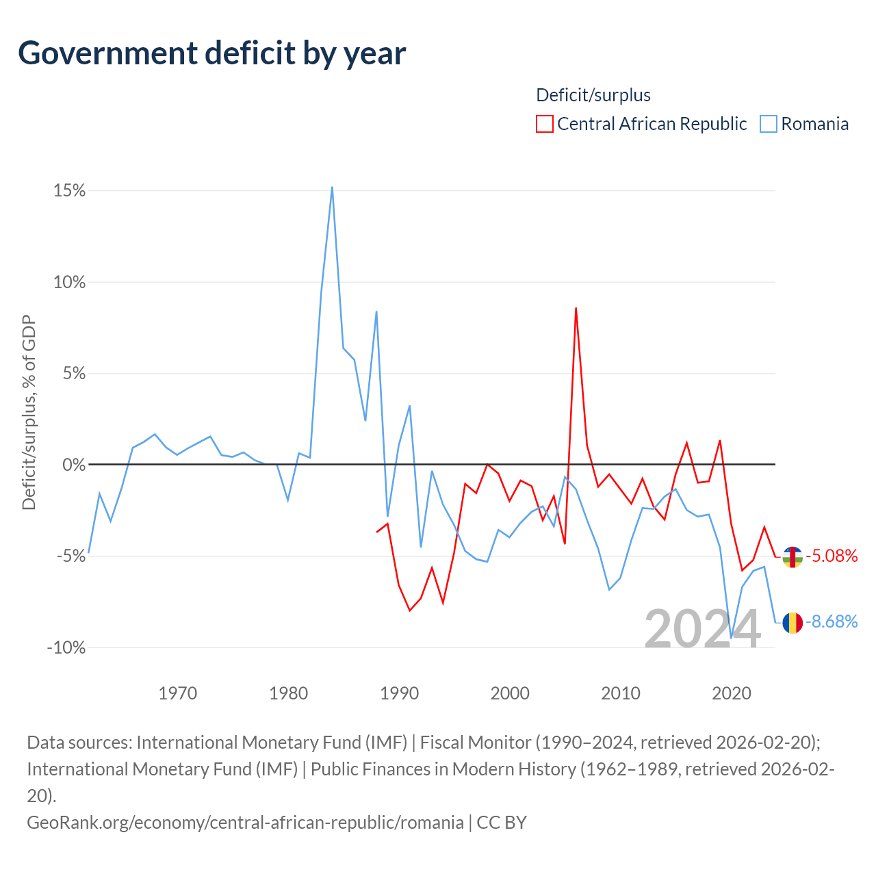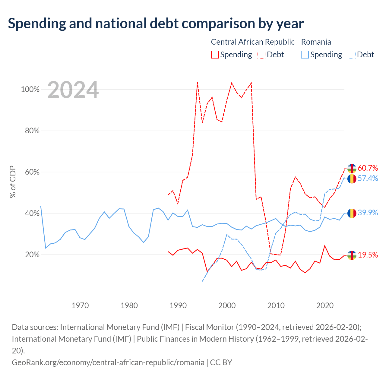 The Central African Republic has $1.67B in government debt (60.7% of GDP), compared to $220B (57.4% of GDP) in Romania.