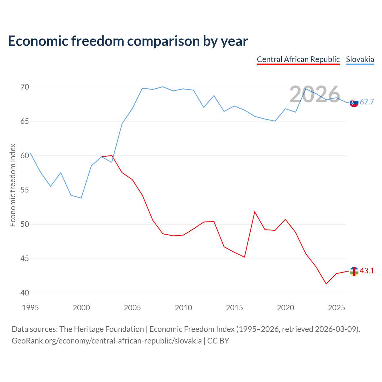 The Economic Freedom Index for the Central African Republic is 43.1, ranking 182/197, compared to 67.7 for Slovakia, ranking 54/197. The chart above displays a comparison of annual changes in economic freedom indexes.