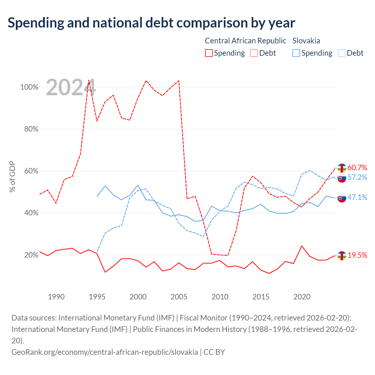 The Central African Republic has $1.67B in government debt (60.7% of GDP), compared to $80.7B (57.2% of GDP) in Slovakia.