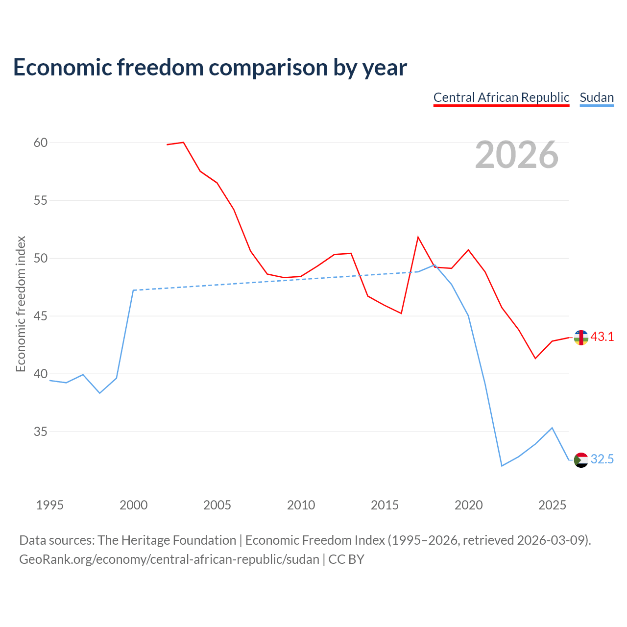 The Economic Freedom Index for the Central African Republic is 43.1, ranking 182/197, compared to 32.5 for Sudan, ranking 191/197. The chart above displays a comparison of annual changes in economic freedom indexes.