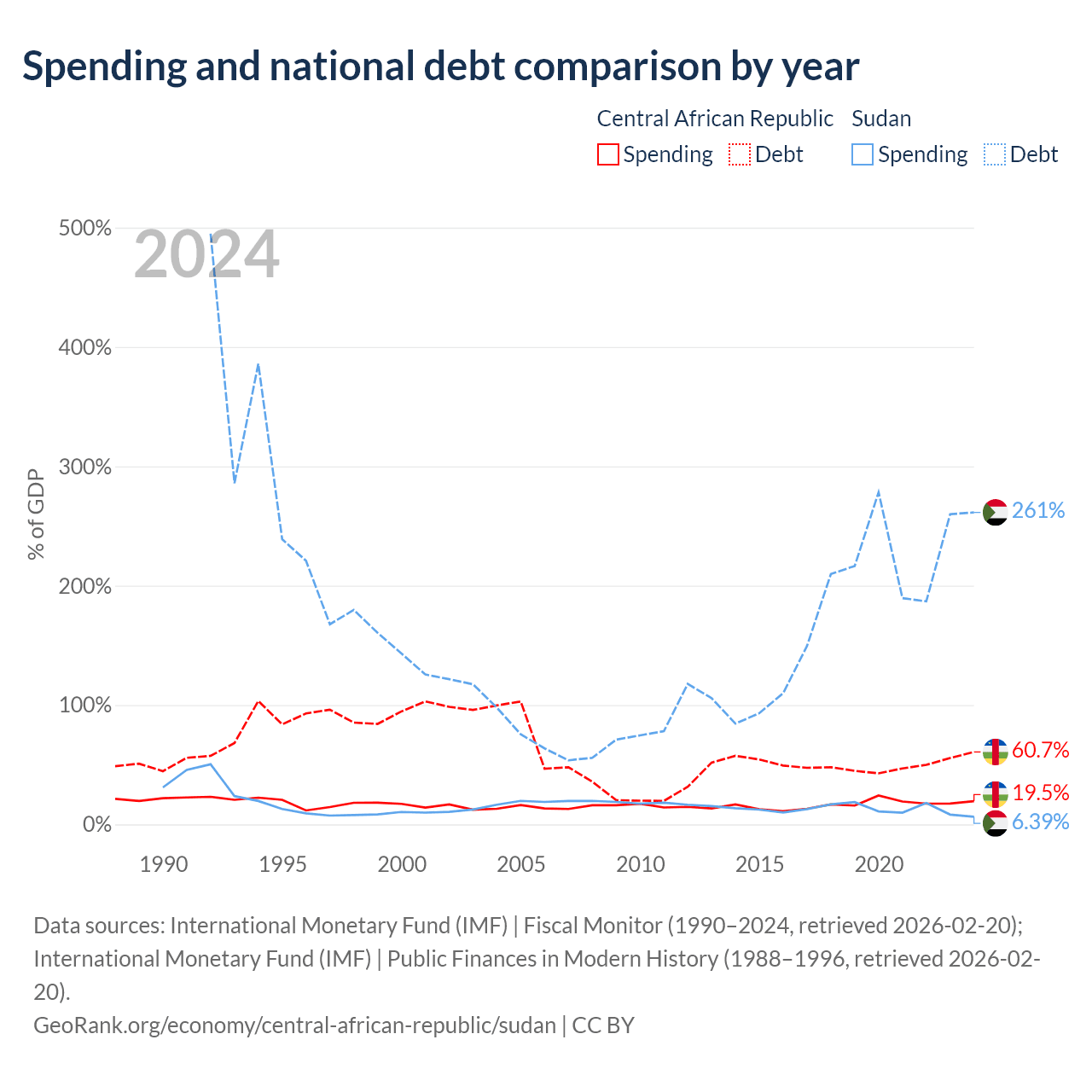 The Central African Republic has $1.67B in government debt (60.7% of GDP), compared to $130B (261.4% of GDP) in Sudan.