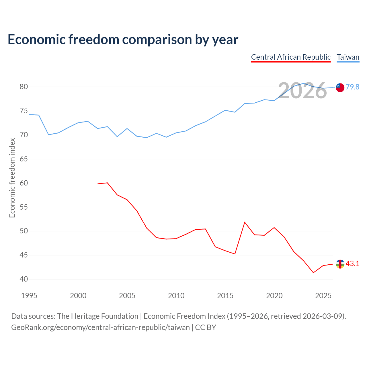 The Economic Freedom Index for the Central African Republic is 43.1, ranking 182/197, compared to 79.8 for Taiwan, ranking 6/197. The chart above displays a comparison of annual changes in economic freedom indexes.