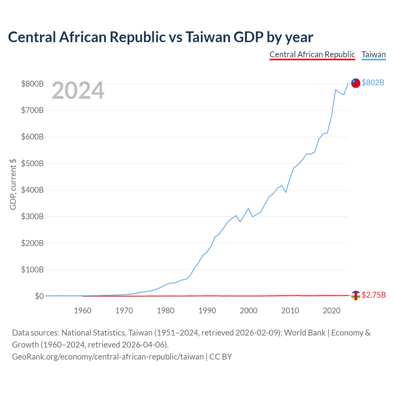 The Central African Republic has a GDP of $2.75B compared to $802B for Taiwan, ranking 171/197 and 22/197 by economy size, respectively.
