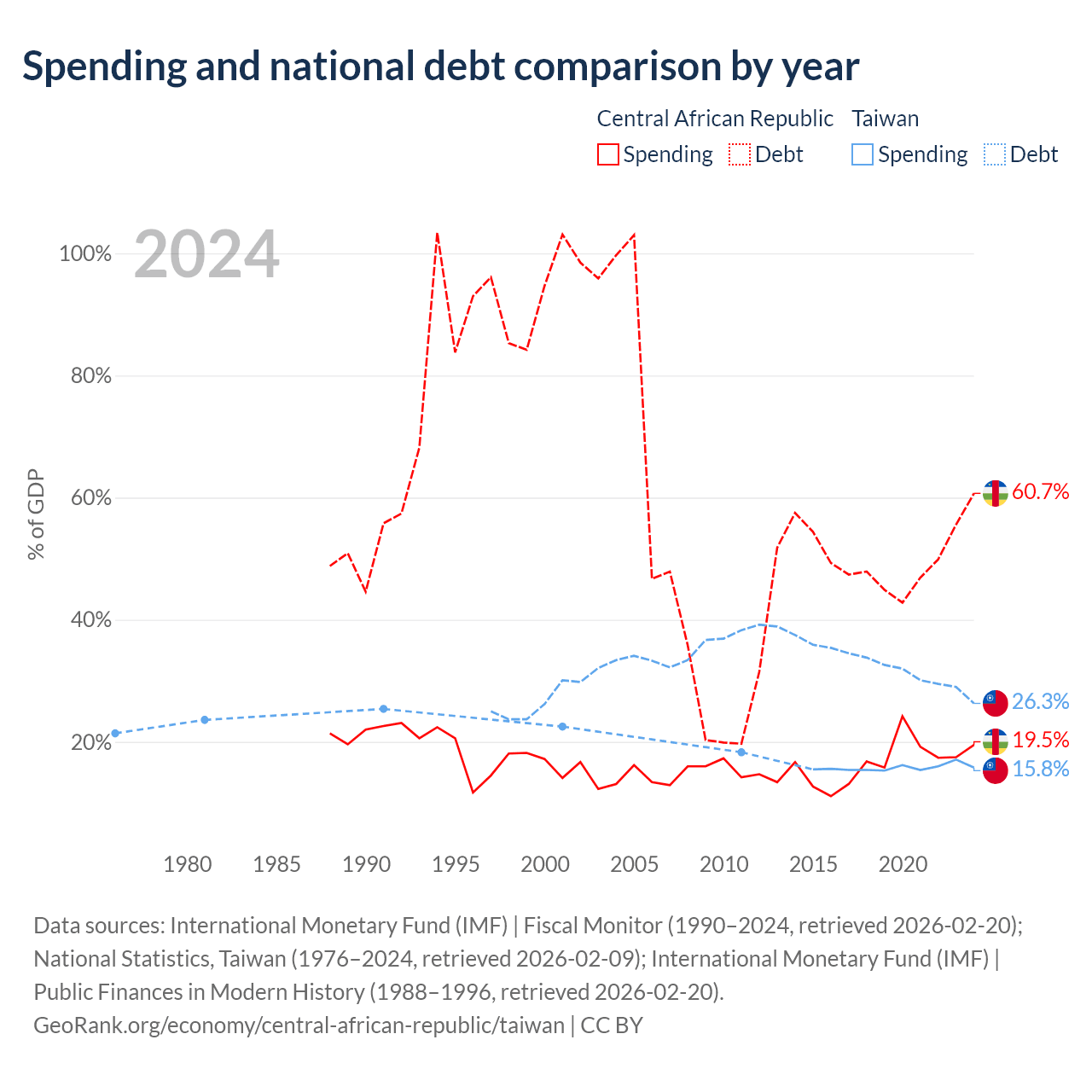 The Central African Republic has $1.67B in government debt (60.7% of GDP), compared to $211B (26.3% of GDP) in Taiwan.